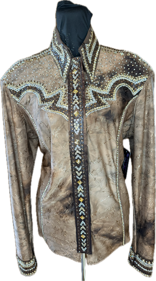 Size Large Brown Printed Lycra Day Shirt with Gold Retro Design