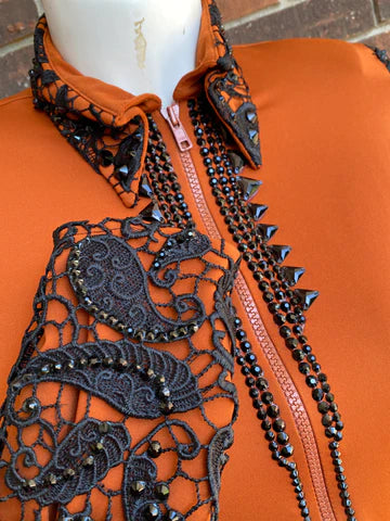 Size Medium red stretch taffeta base with hidden zipper silver, black and soft turquoise accents