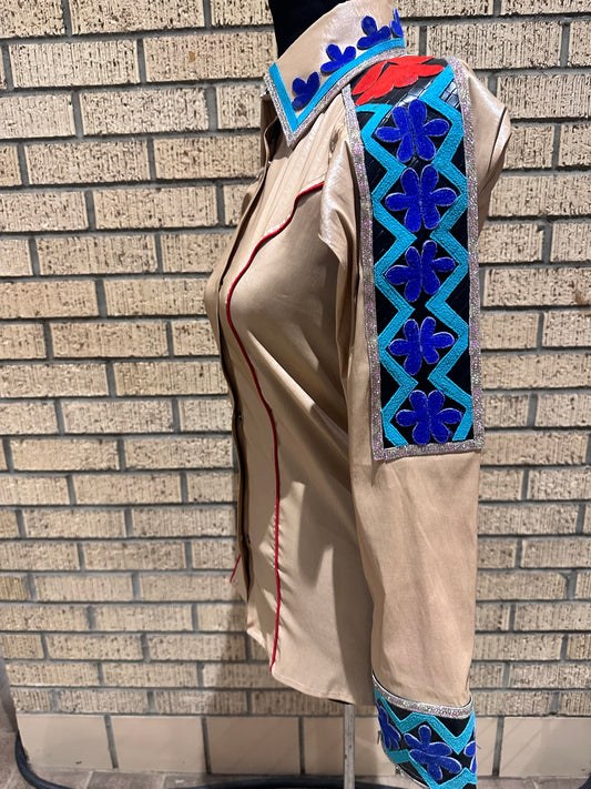 Size small day shirt bright red stretch taffeta with royal, aqua and clear accents