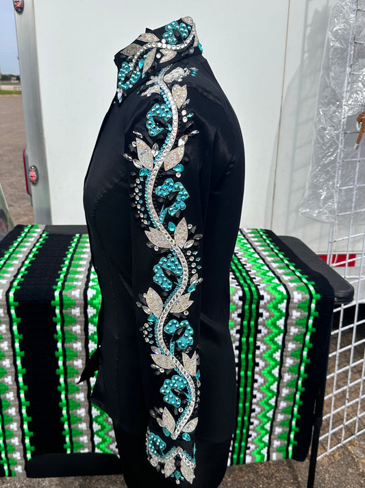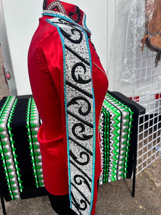 XS day shirt stretch taffeta red with aqua, black and silver accents