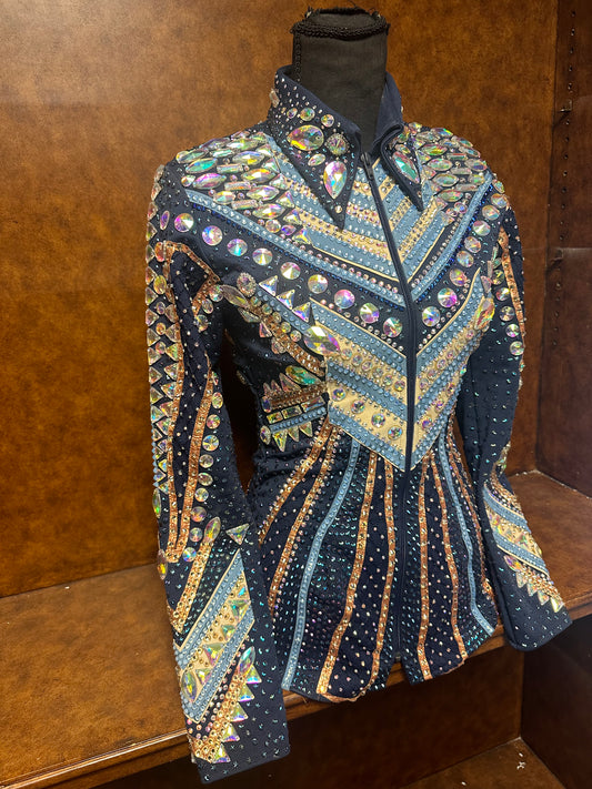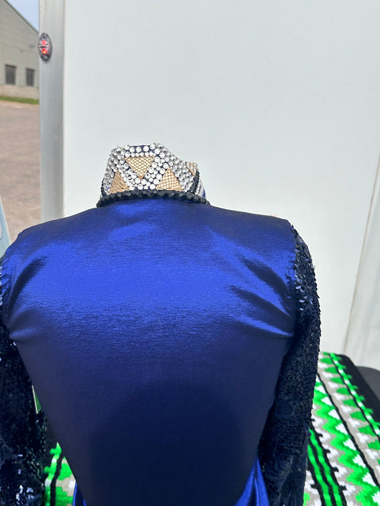 XS day shirt stretch taffeta navy with gold accents sequin sleeves