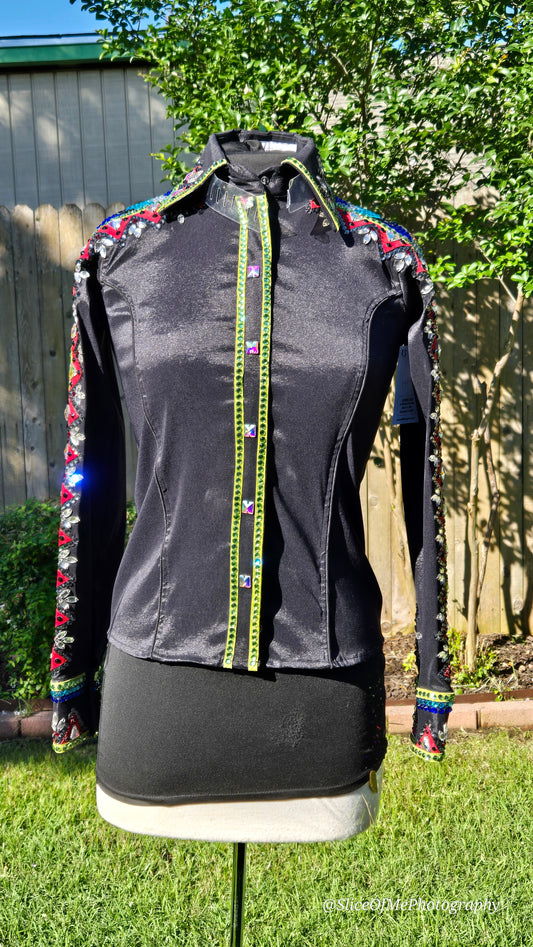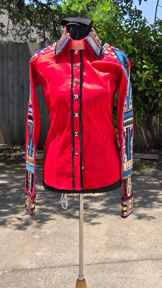 XS Stretch Taffeta day shirt Show Red with Dark Turquoise, Black, Pink, and Citrine