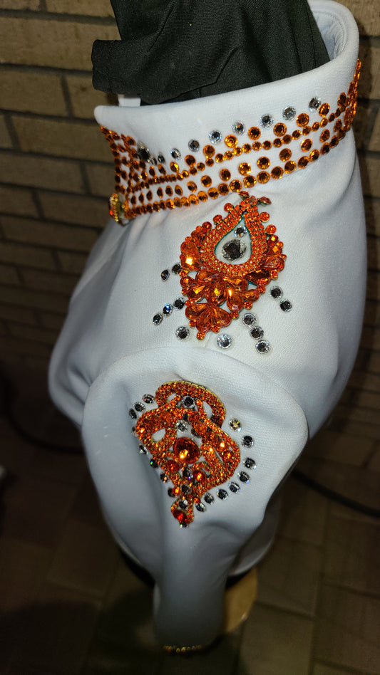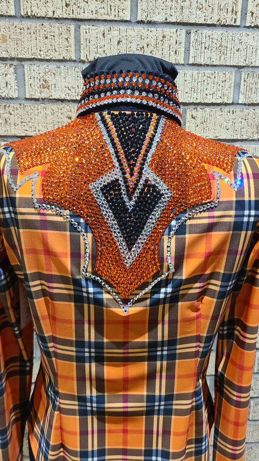 XS Orange and Black Plaid day shirt stretch taffeta with silver and burnt orange design