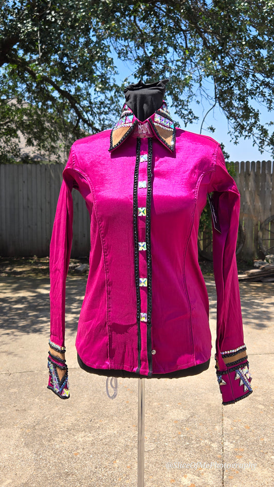 XS Stretch Taffeta day shirt Fuchsia with black, matte silver, gold