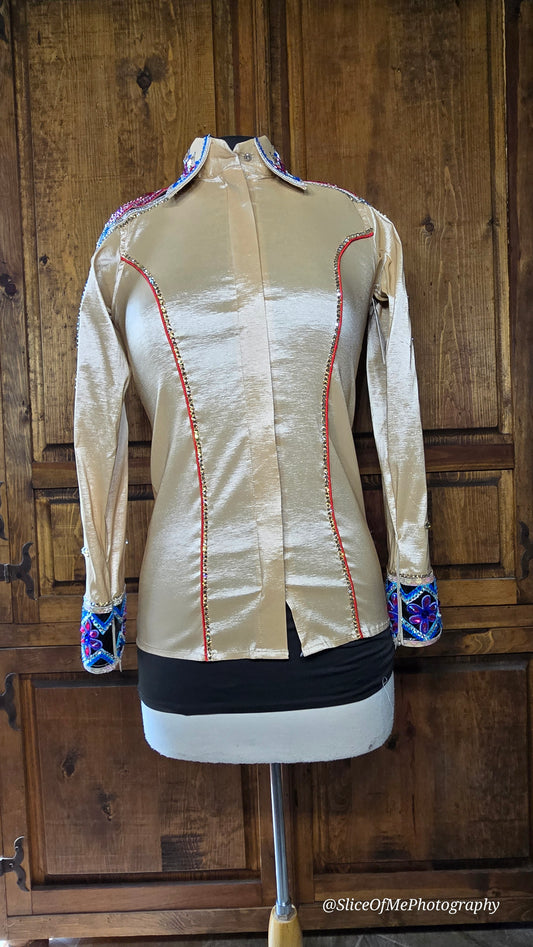 XS Fawn Stretch Taffeta Day Shirt Zippered Cuff with show red, royal blue, silver, white gold with