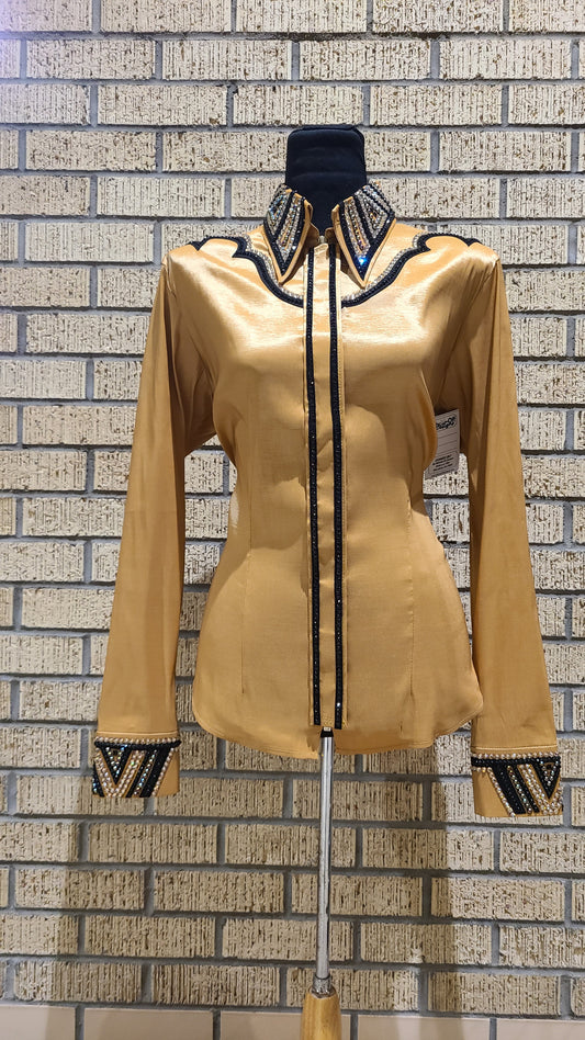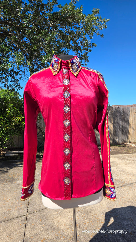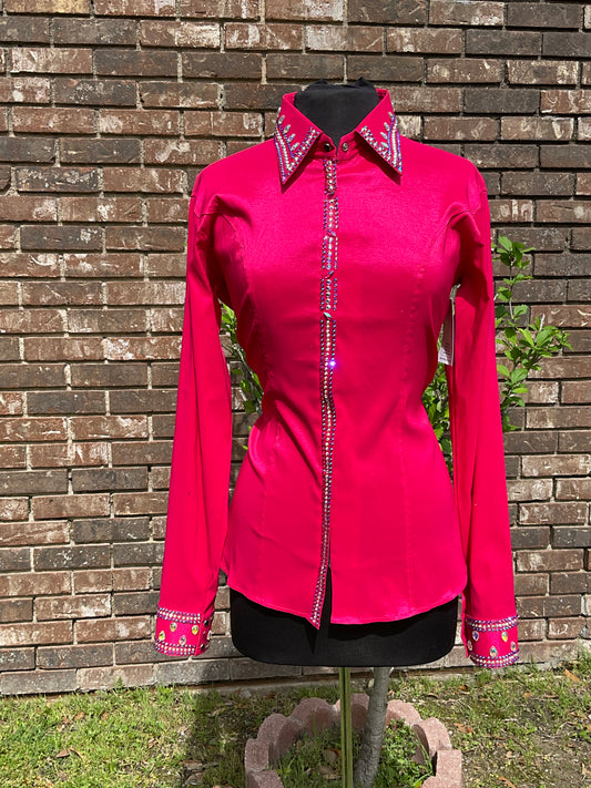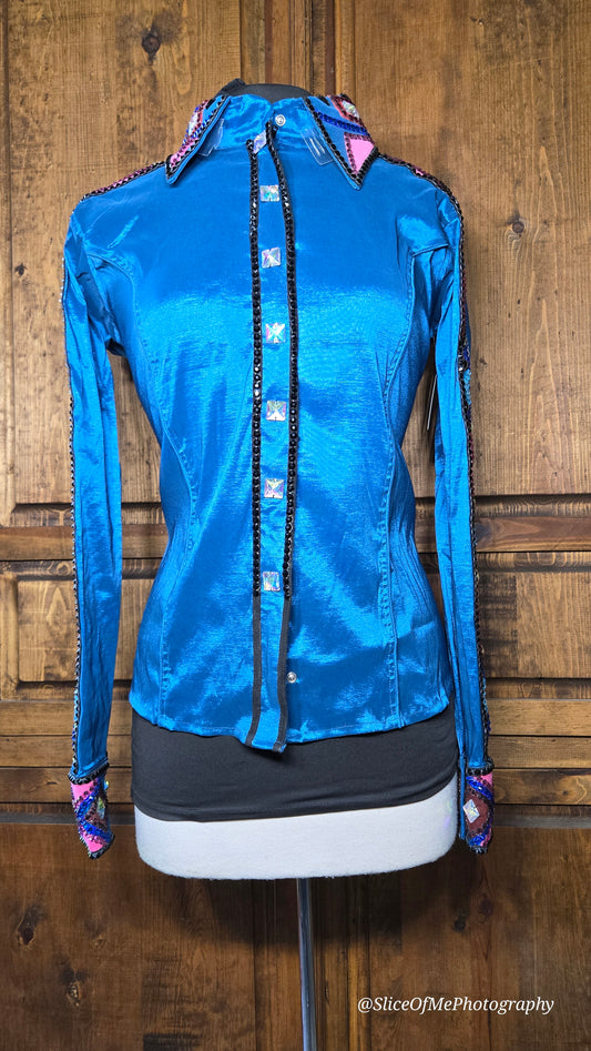 XL stretch taffeta Show Teal day shirt with hot pink, royal blue, copper, show red, citrine black