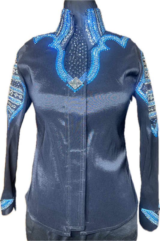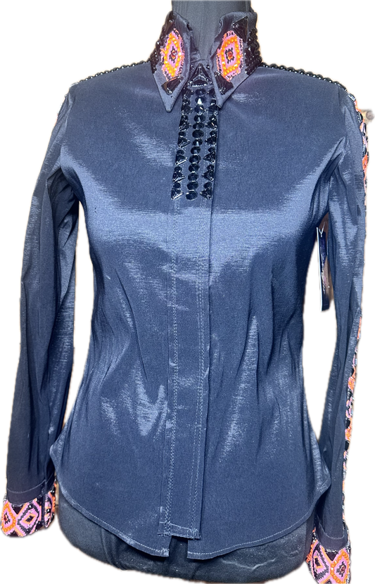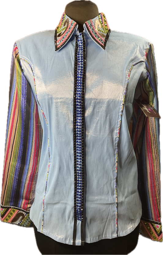 XL sly blue stretch taffeta day shirt with colorful printed sleeves and accents