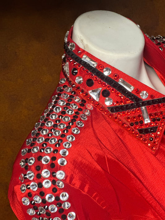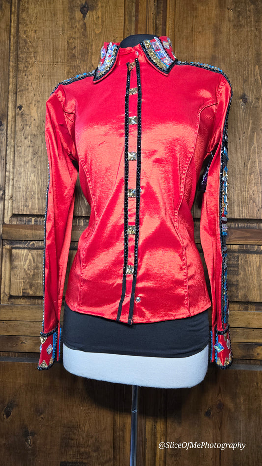 XL stretch taffeta Red day shirt with Turquoise, clear, black and gold
