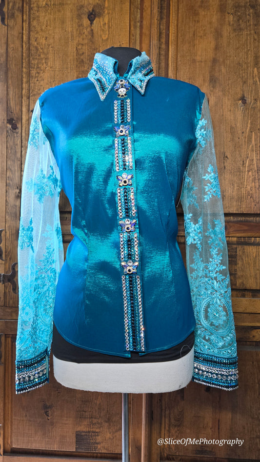 XL Stretch Dark Turquoise Day Shirt with black, silver, turquoise, and lace sleeves