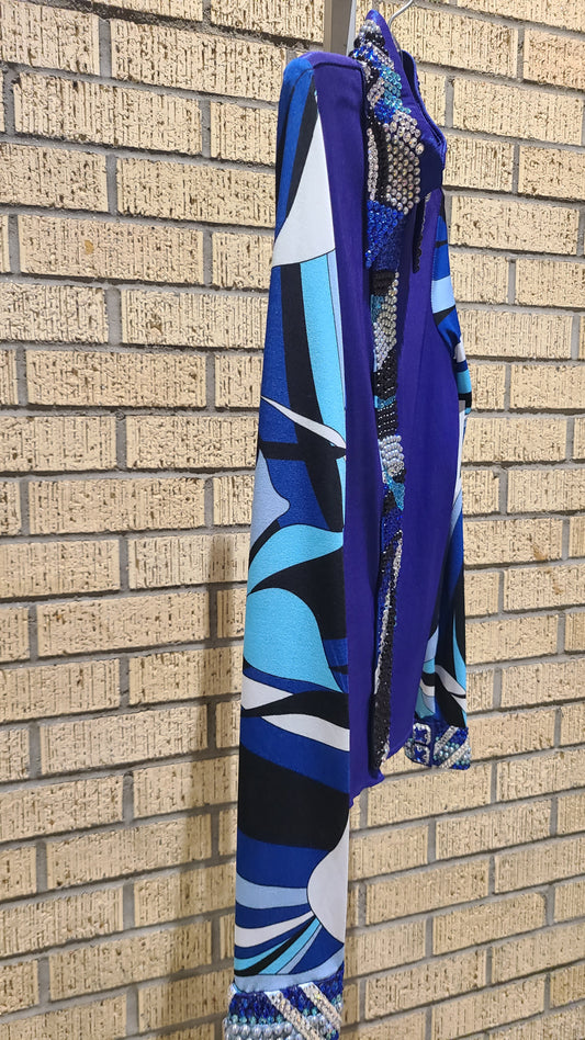XS Cobalt day shirt stretch taffeta with black, white, and silver