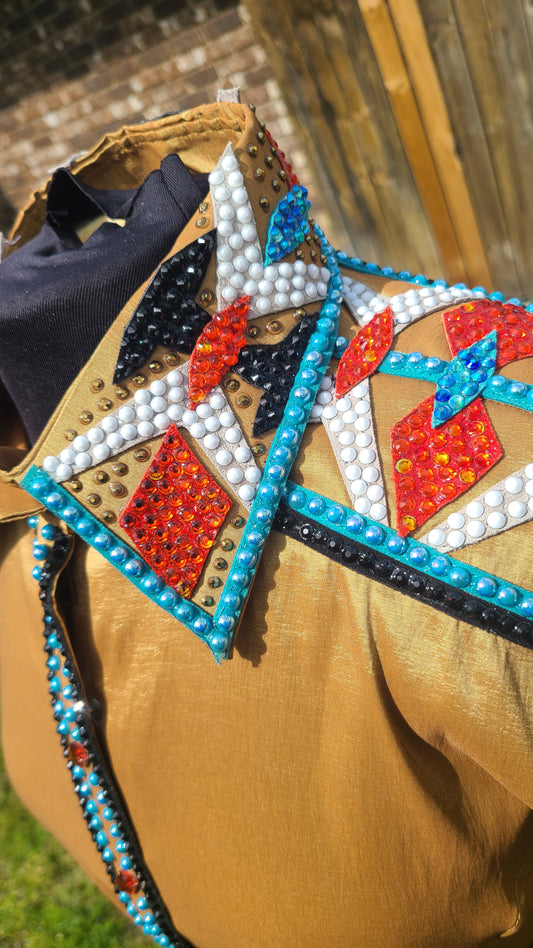 XXL Gold Day Shirt hidden zipper stretch taffeta with Turquoise, Black and burnt orange