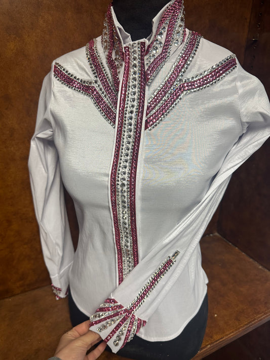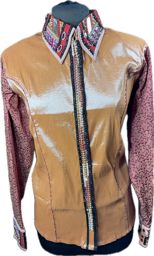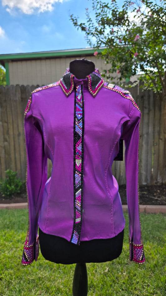 XXL Purple Stretch Taffeta Day Shirt with black, brown gold, pink