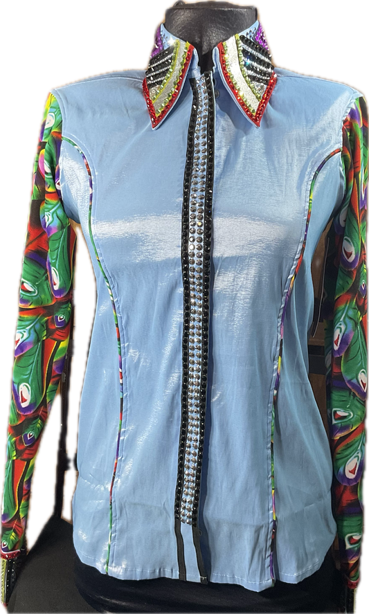 Small showmanship jacket airbrushed design with blues, copper and silver