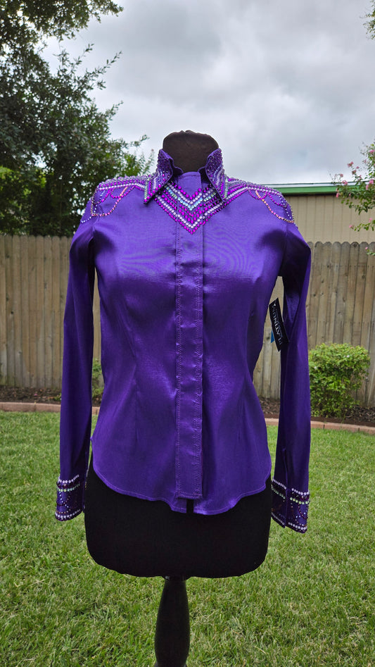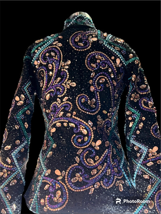Small Showmanship Jacket. Black with purple, rose gold, teal.