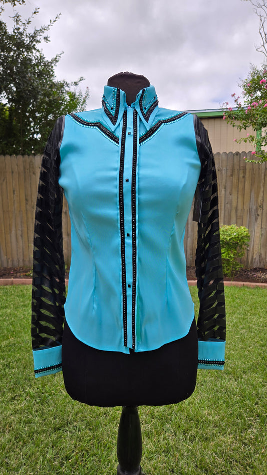 Small Soft Turquoise Stretch Taffeta Day Shirt with black and lace sleeves