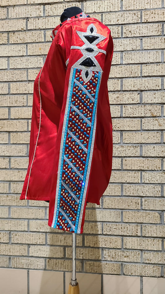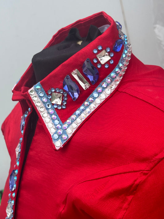 Size small day shirt bright red stretch taffeta with royal, aqua and clear accents