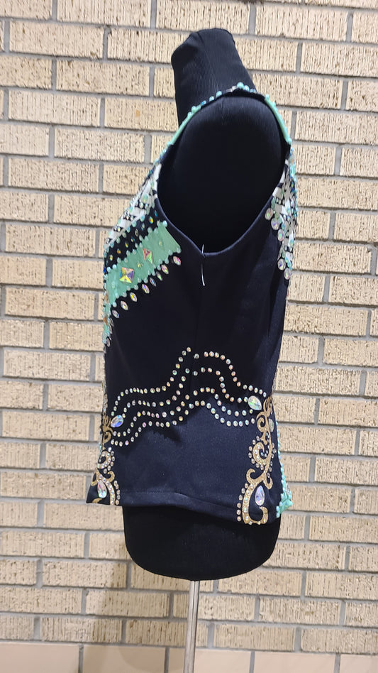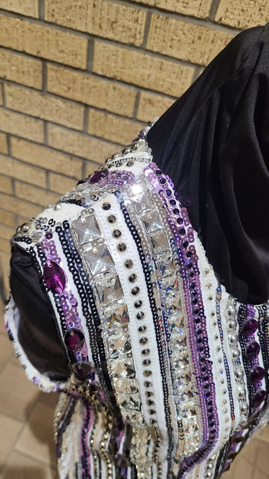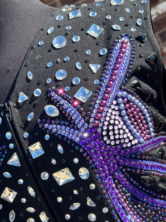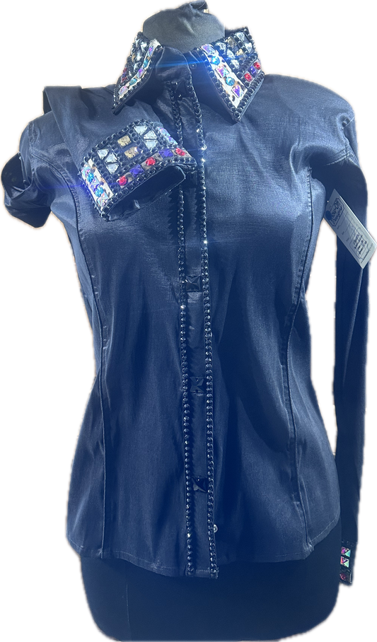 Medium black stretch taffeta day shirt. Red and blue crystals