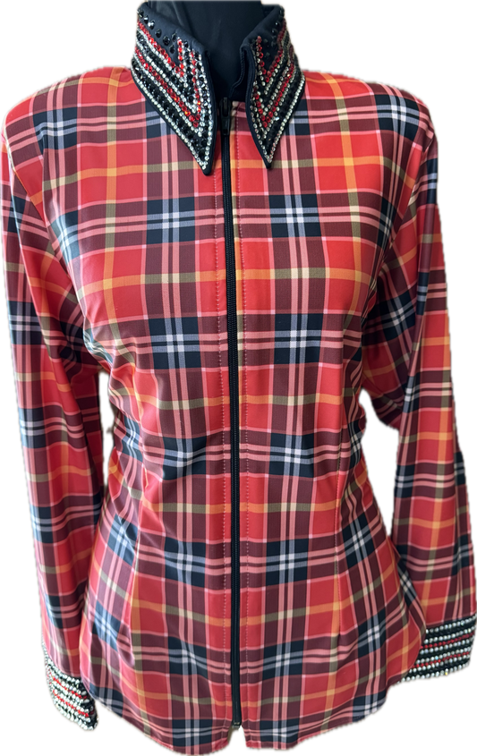 Large day shirt black and orange plaid lycra day shirt with crustal accents