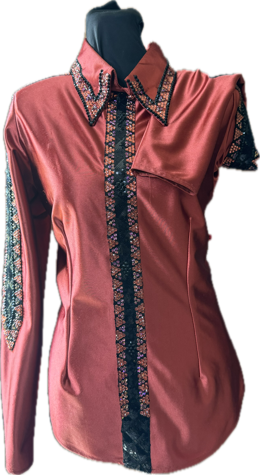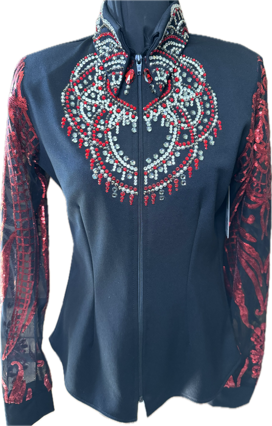 Size small black stratch day shirt with red sequin lace sleeves