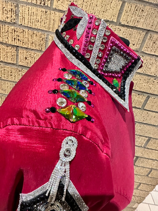 XS day shirt stretch taffeta red with aqua, black and silver accents