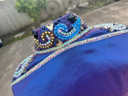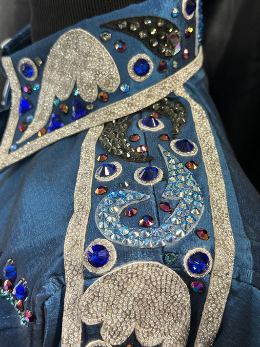 Day Shirt Size Medium cobalt blue stretch taffeta base with hidden zipper. gold and white accents. Gorgeous sequin sleeves