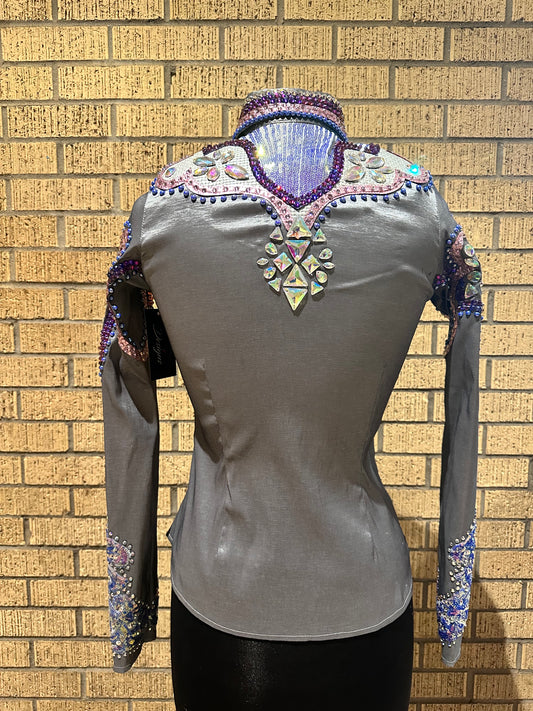 Extra Small day shirt. Stretch taffeta hidden zipper grey with pinks and purples