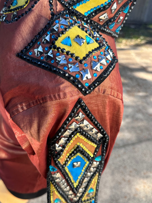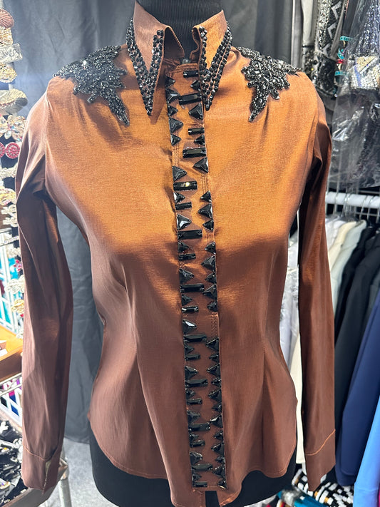 Size small day shirt Rust stretch taffeta with black accents STUNNING!