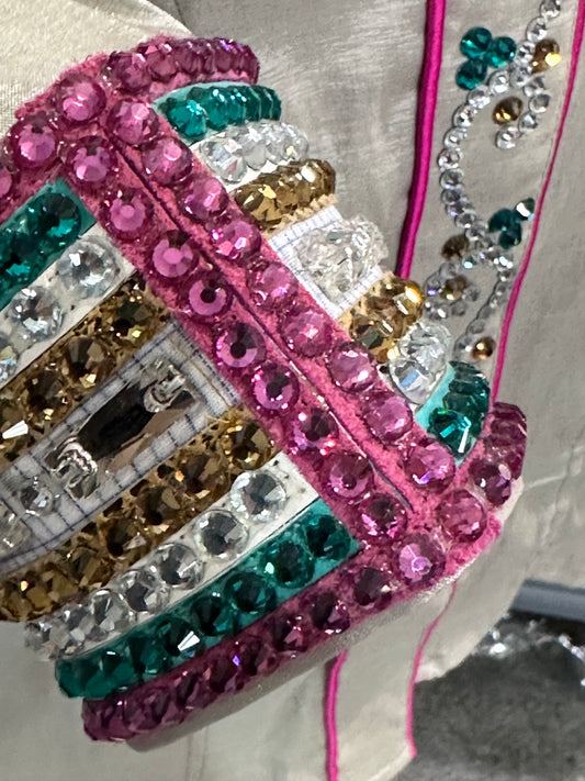Day Shirt Size Medium silver stretch taffeta base with hidden zipper. Pink and turquoise accents