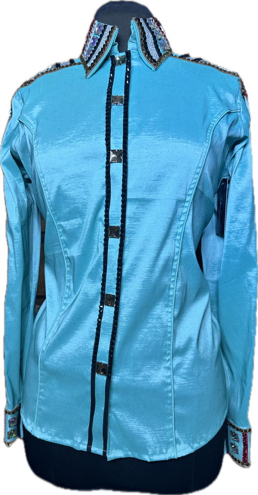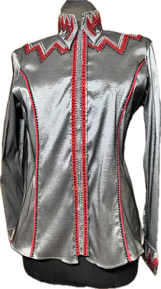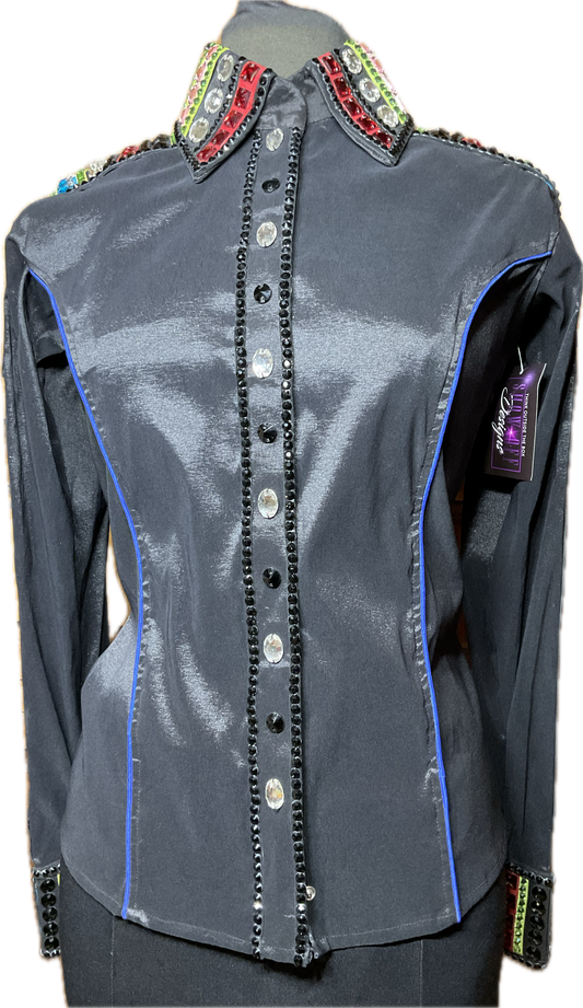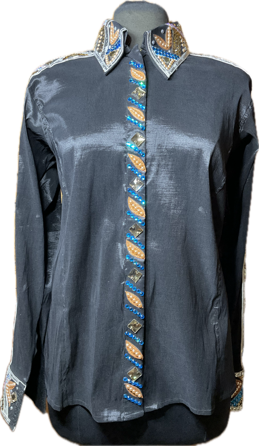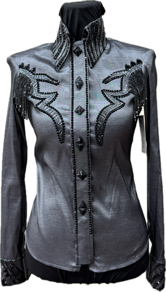Extra Small Charcoal Stretch Taffeta Day Shirt with Retro Design and Black Crystal Fringe
