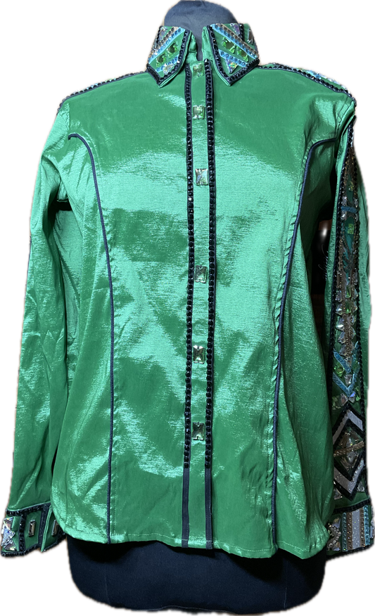 Size Large Jade Green Stretch Taffeta with black, gold and aqua accents