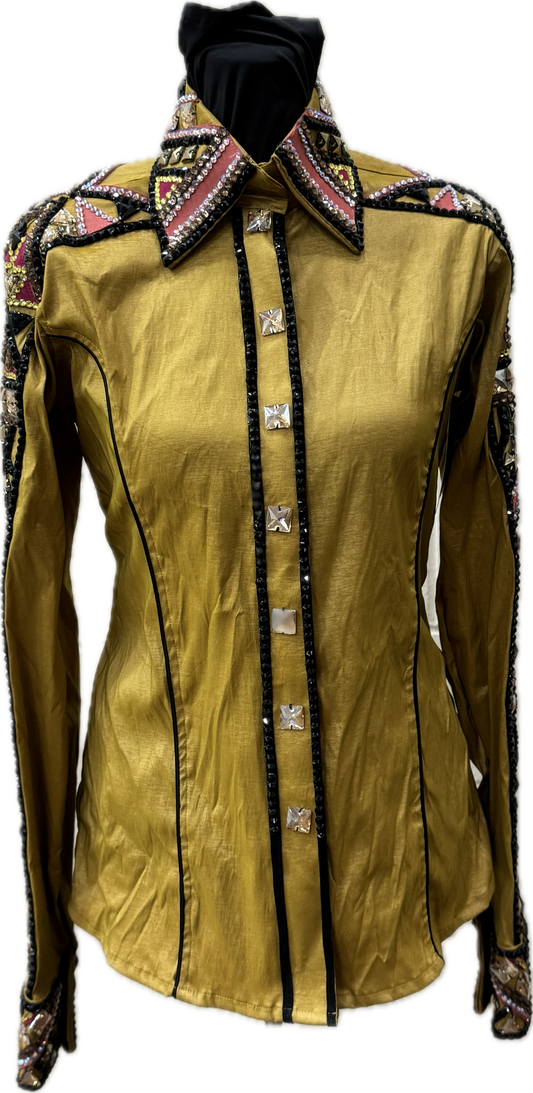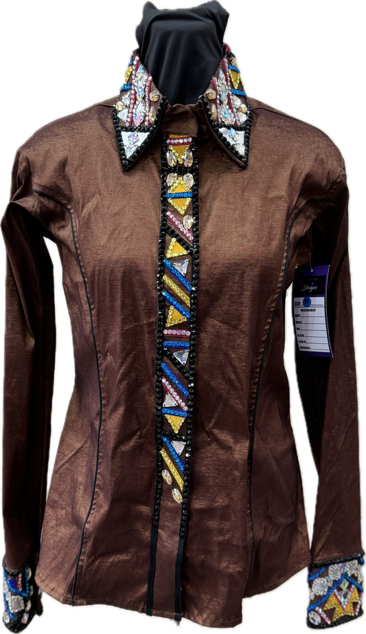 Size Medium Dark Copper stretch taffeta with black, pink, royal and yellow accents