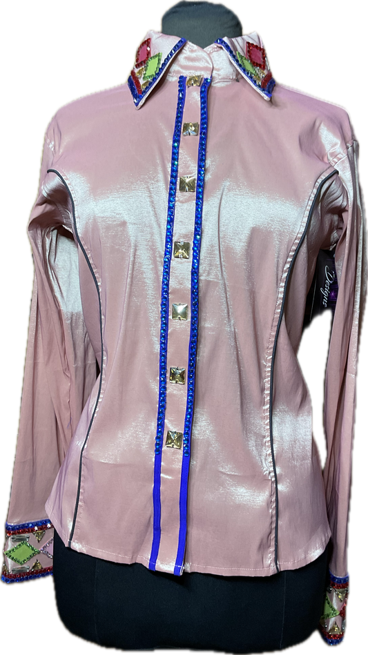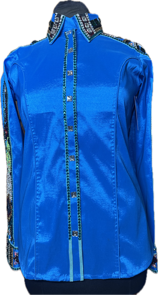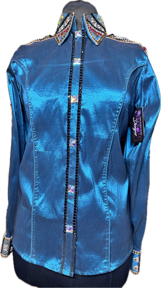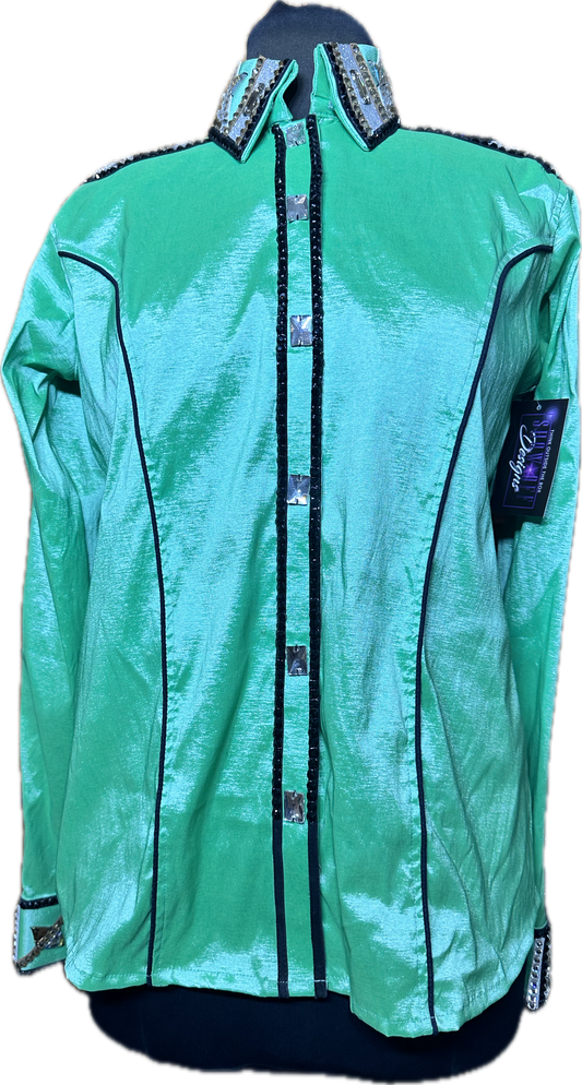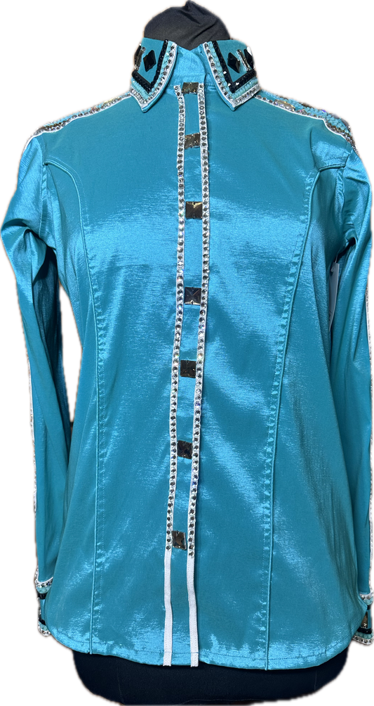Size Medium Bright Teal Stretch Taffeta Day Shirt with Black, Gold and Mint