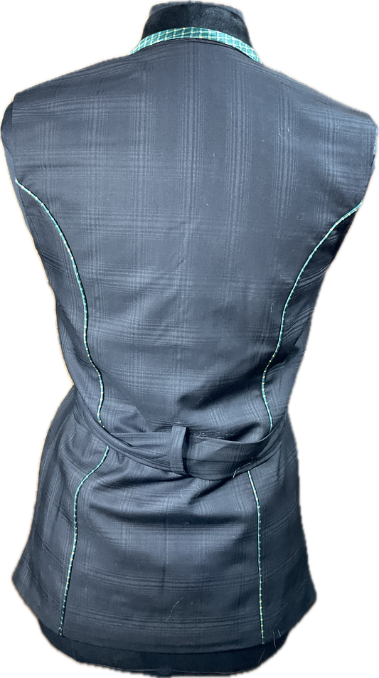 *33 Bust* Black plaid with emerald green geometric print trims with belt option