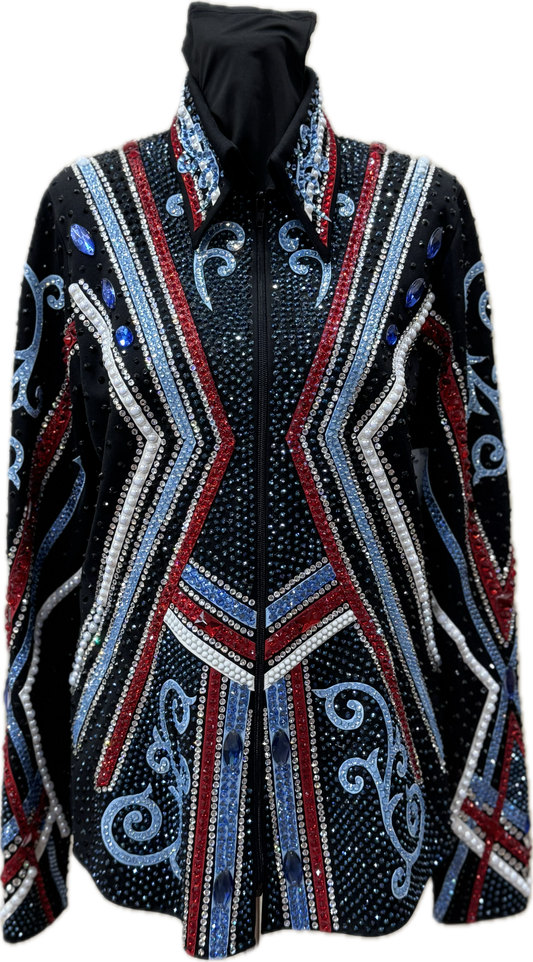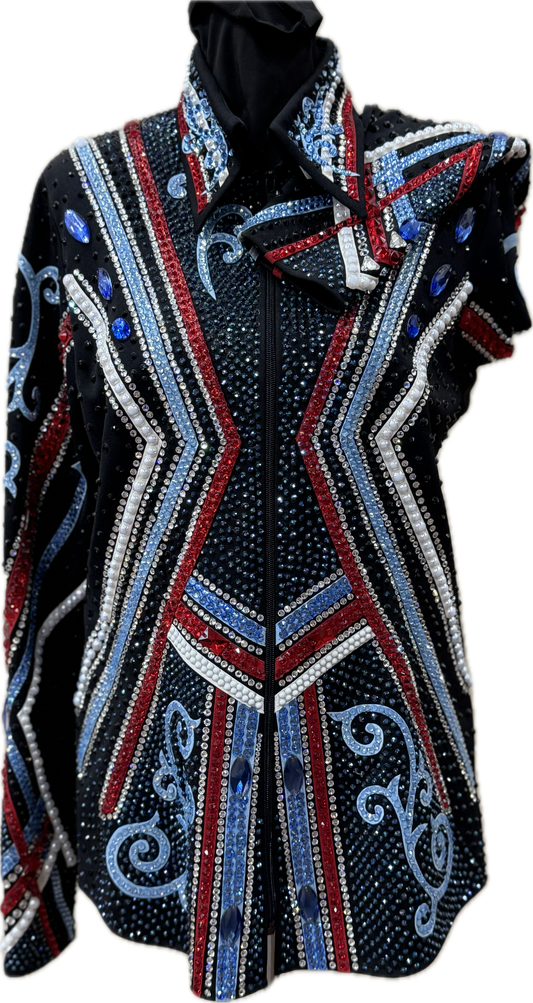 Large Black Showmanship Jacket with Red, Royal Blue and Sky Blue Accents