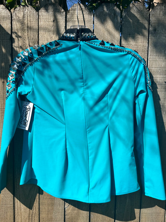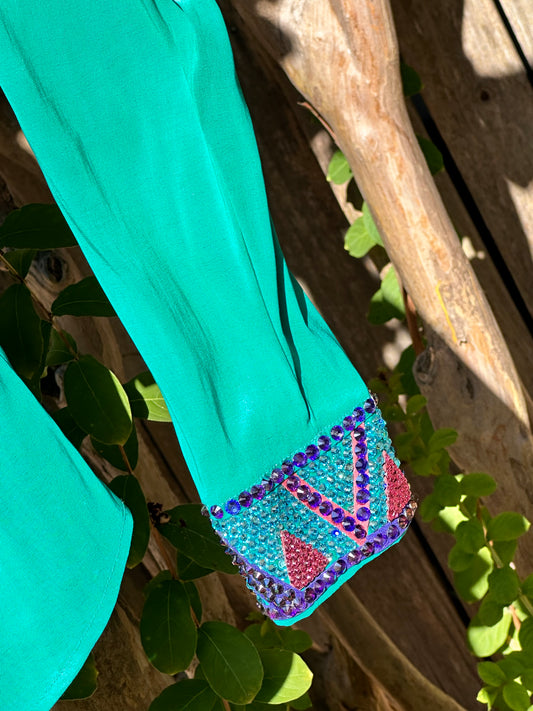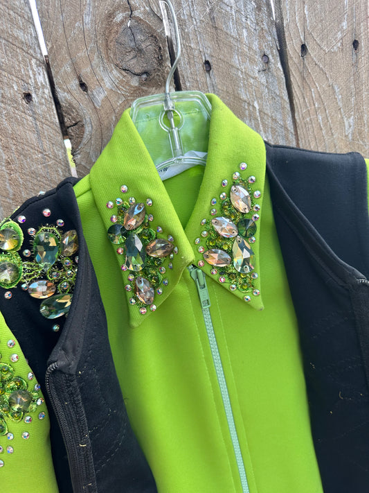 Kids size 10 Avocado Stretch Taffeta Day Shirt with Black Design, Black, Gold Stones