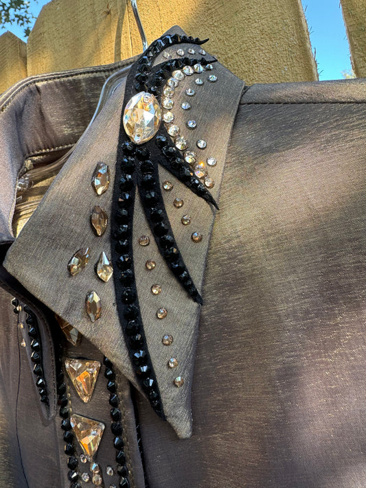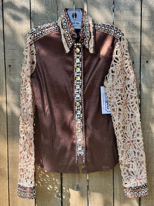 Kids size 12 brown stretch taffeta day shirt with gold and black