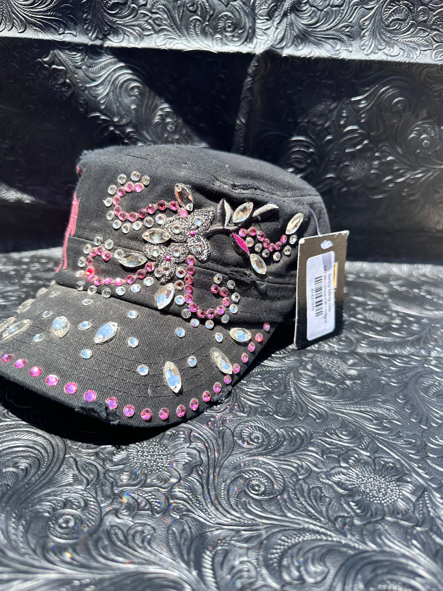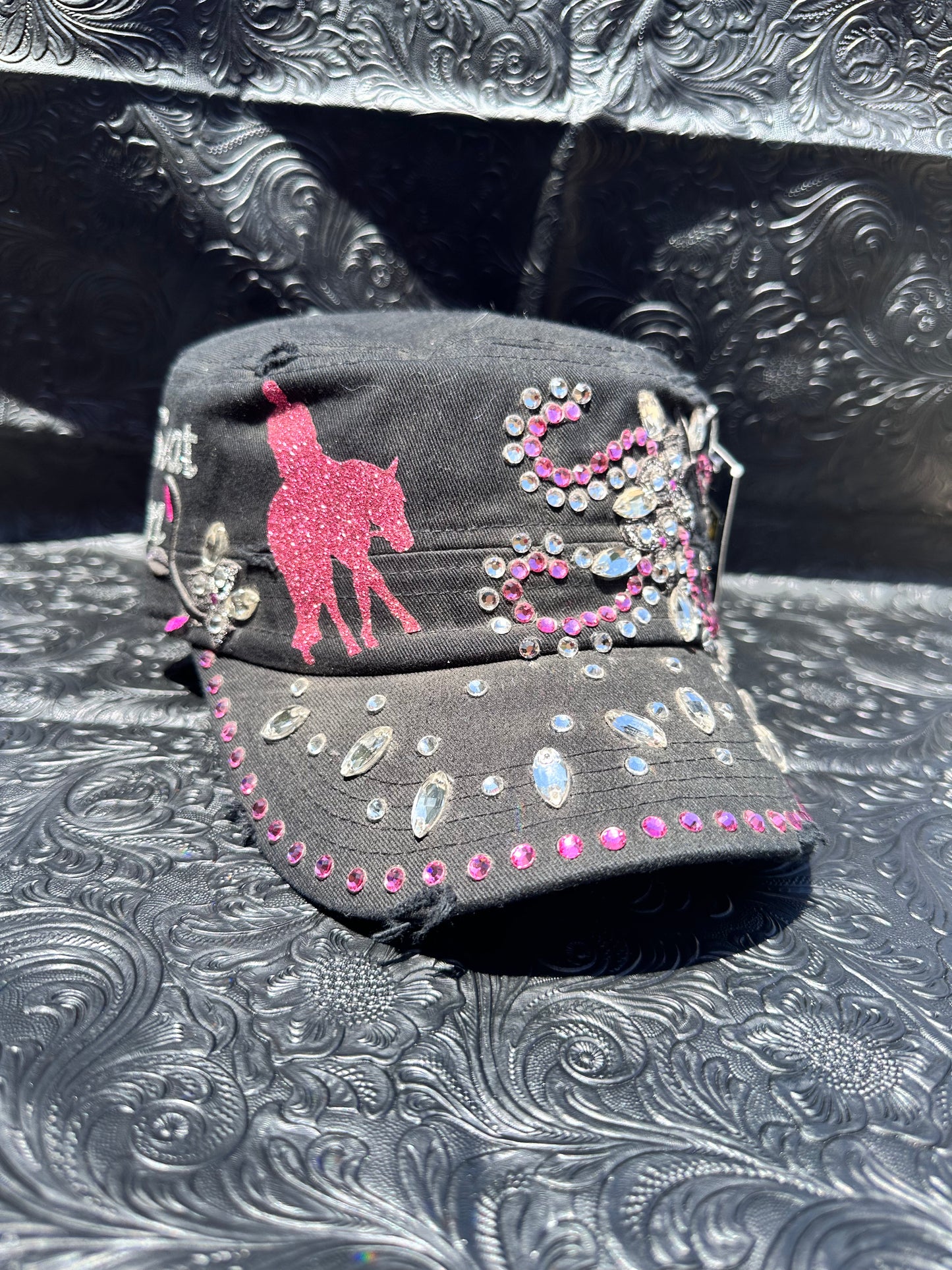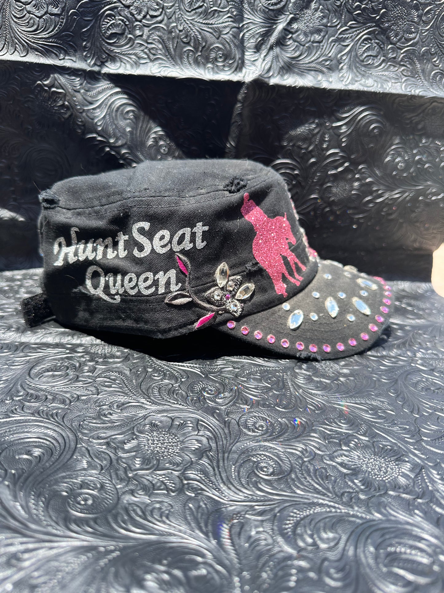 Fancy Bling cap-one of a kind and hand crafted. Black cadet cap with pink hunt seat horse. Hunt Seat Queen lettering. Stunning design for sure!