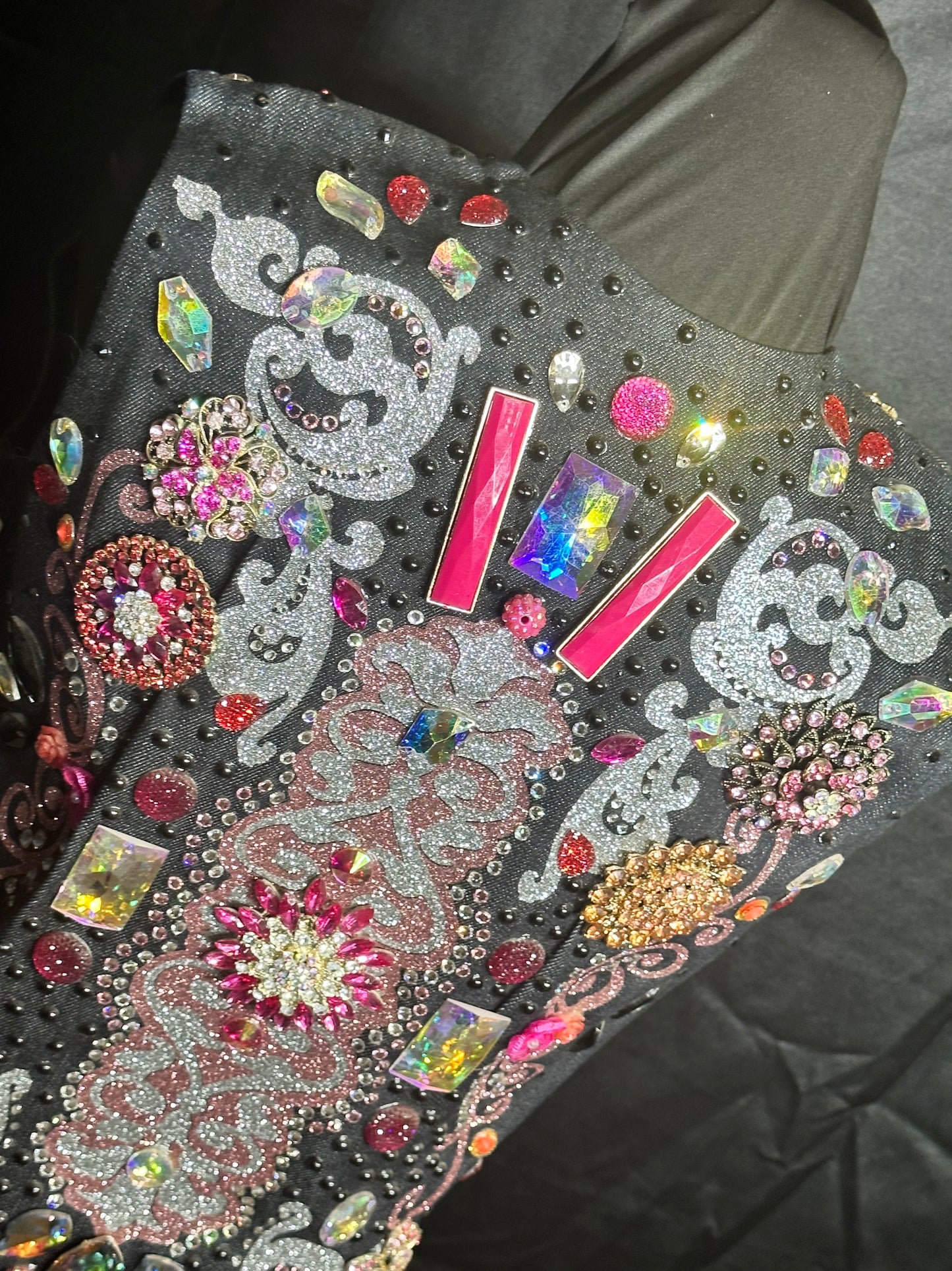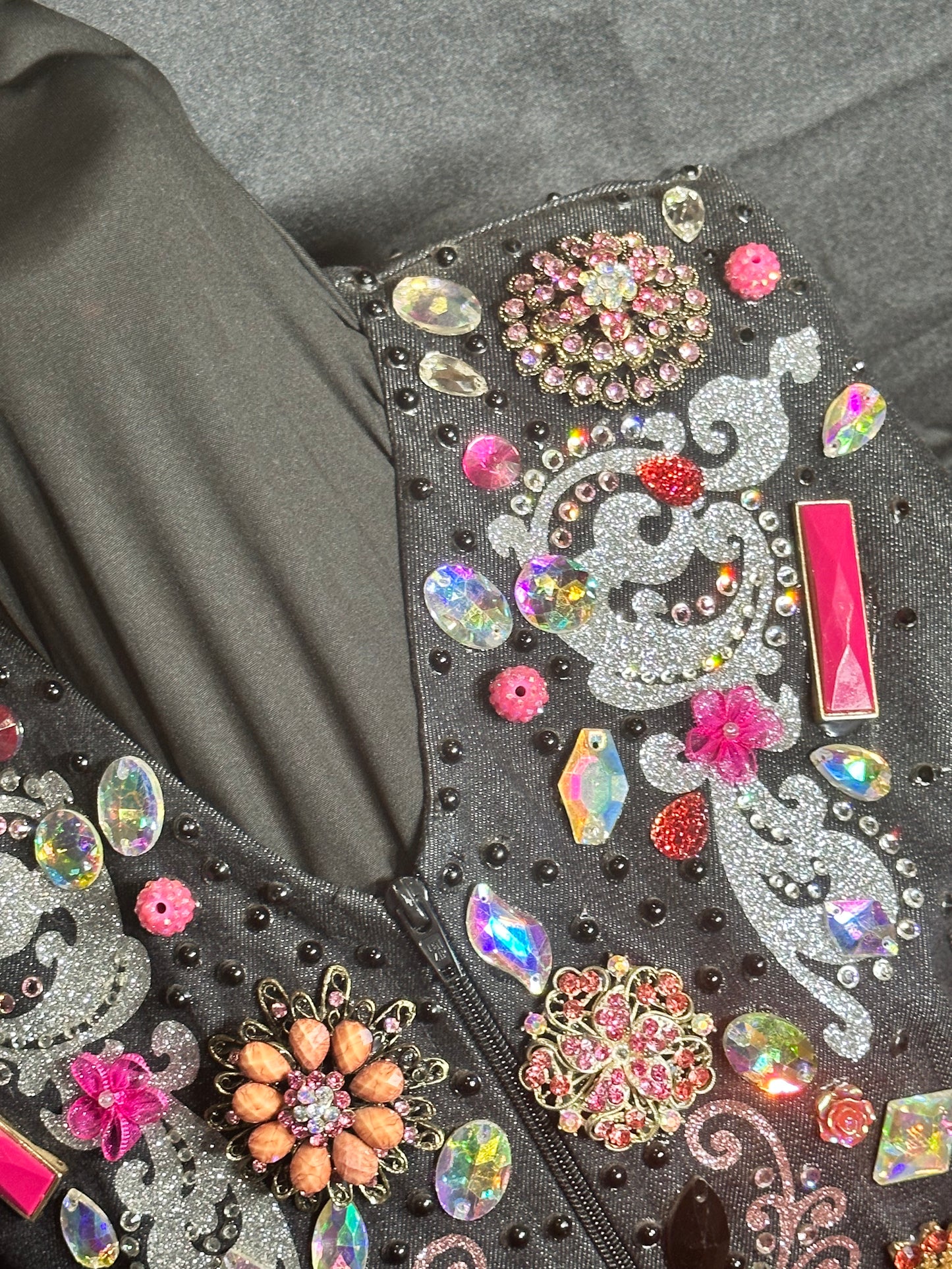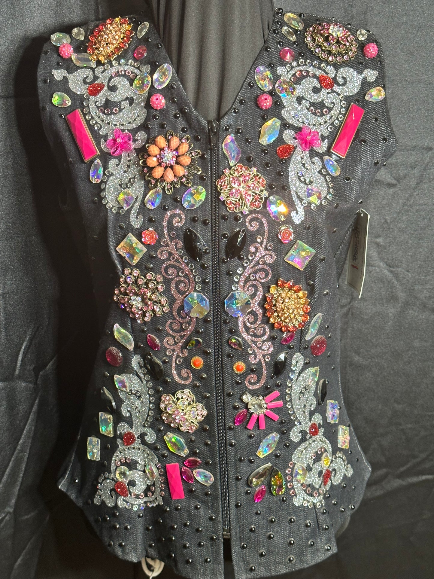 Black stretch denim fabric for the base. This vest has a ton of stretch in it. Design is silver and pink with abstract placement of embellishments. LOVE IT!!!!!!!!!!!