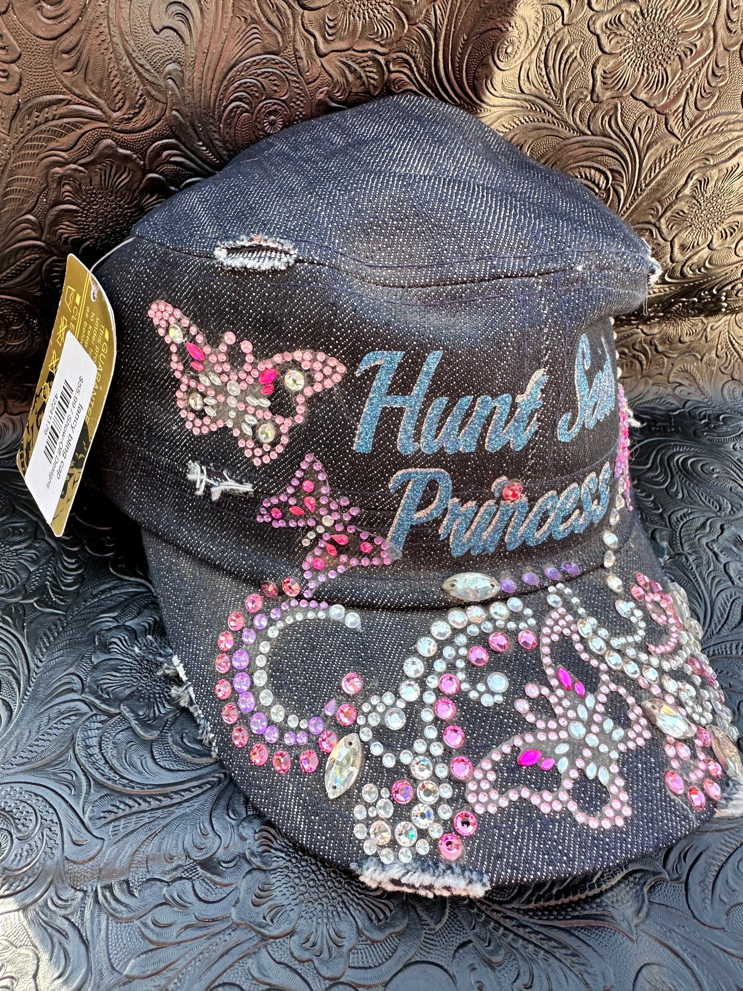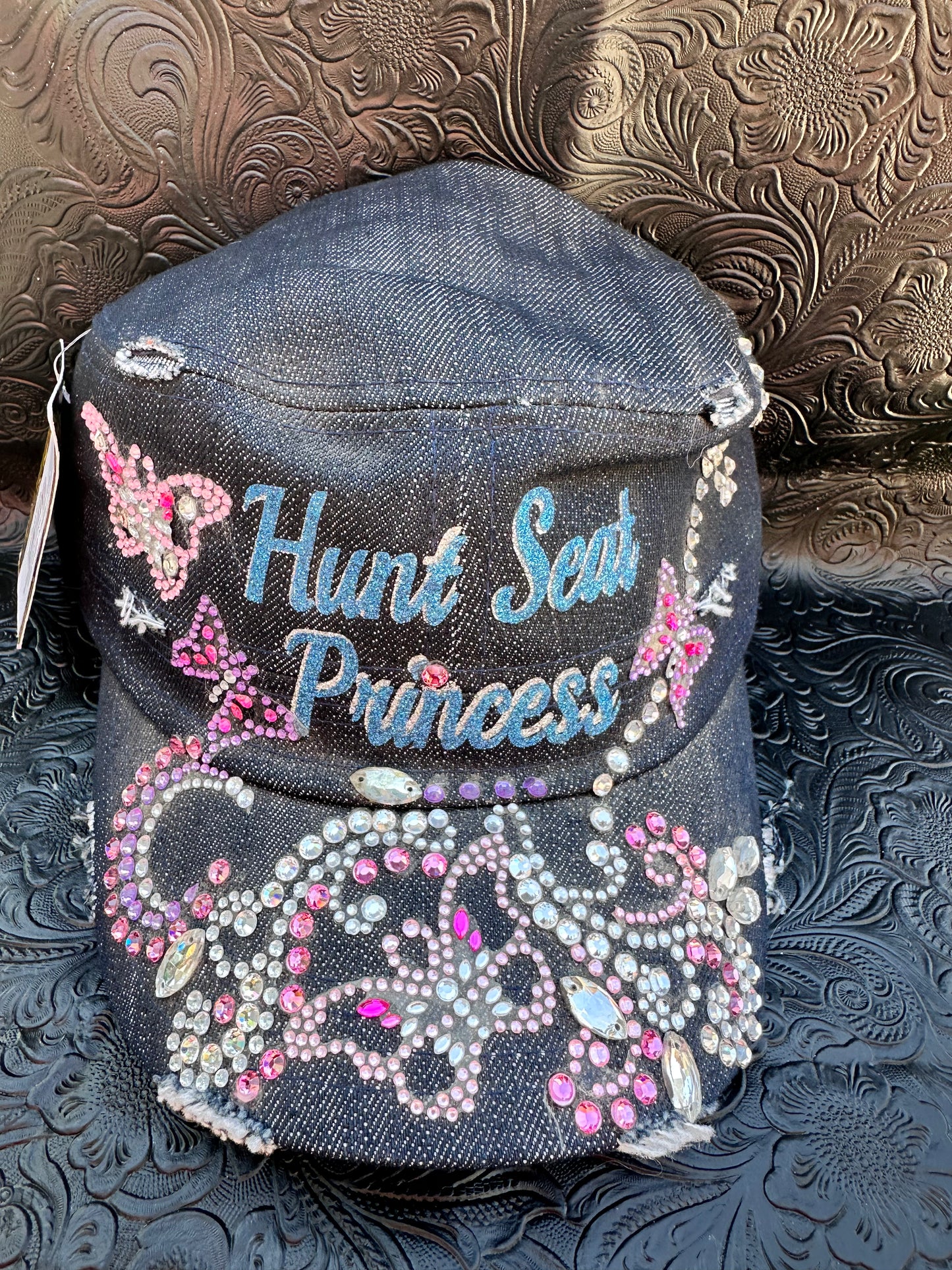 Fancy Bling ap-one of a kind and hand crafted. Denim cadet cap with turquoise and pink design. Butterfly accents in the crystaled design.