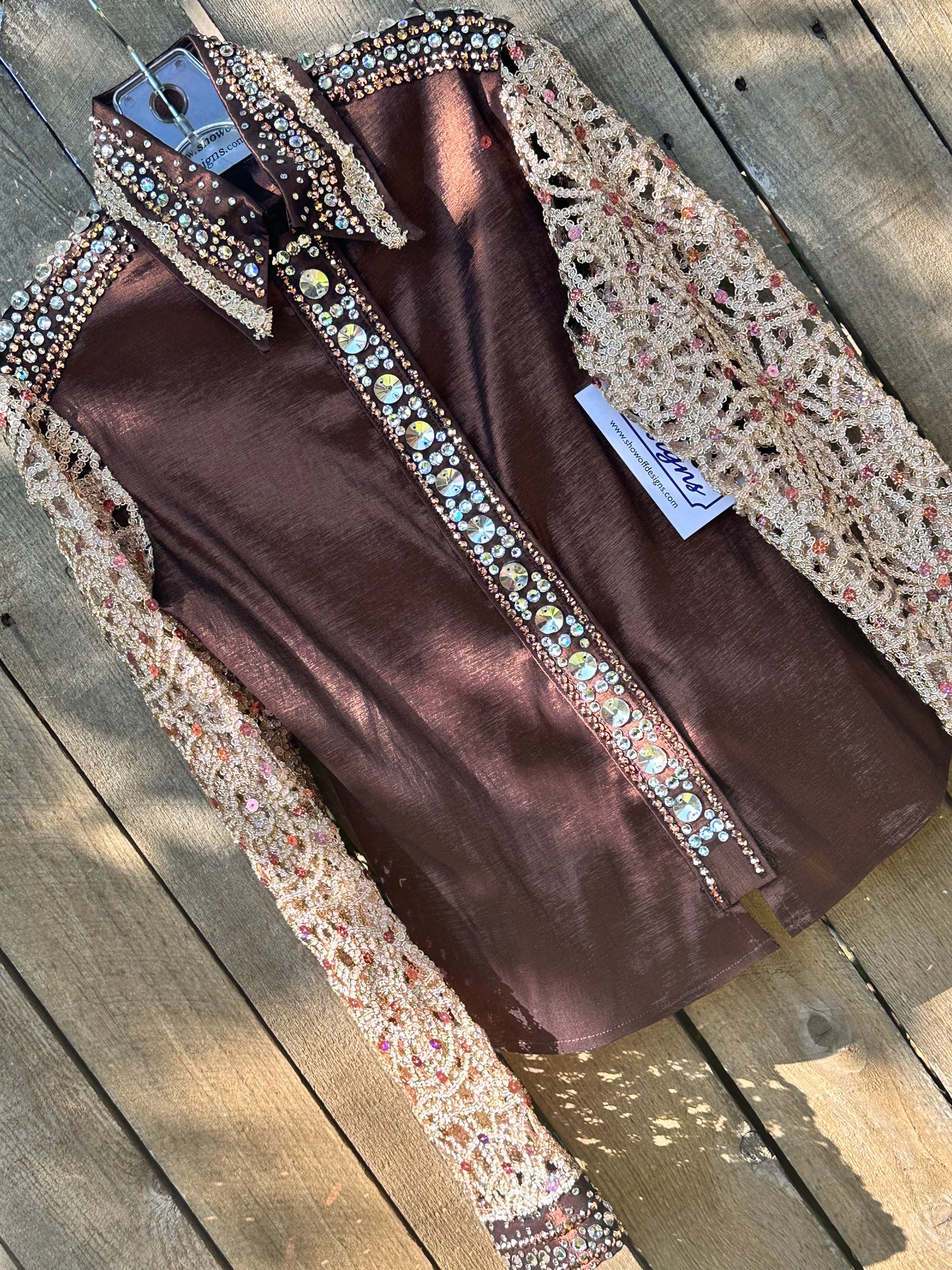 Kids size 12 brown stretch taffeta day shirt with gold and black