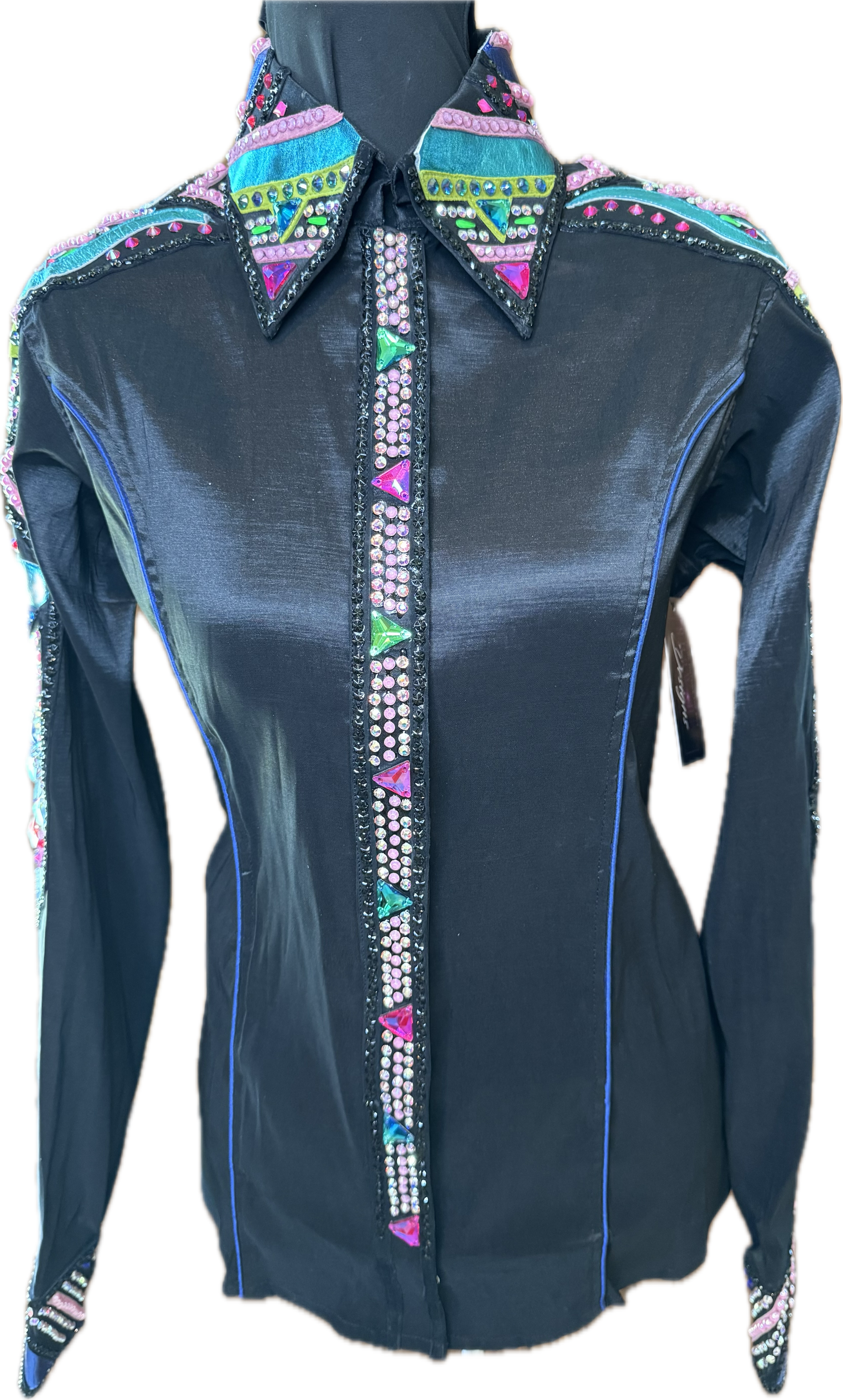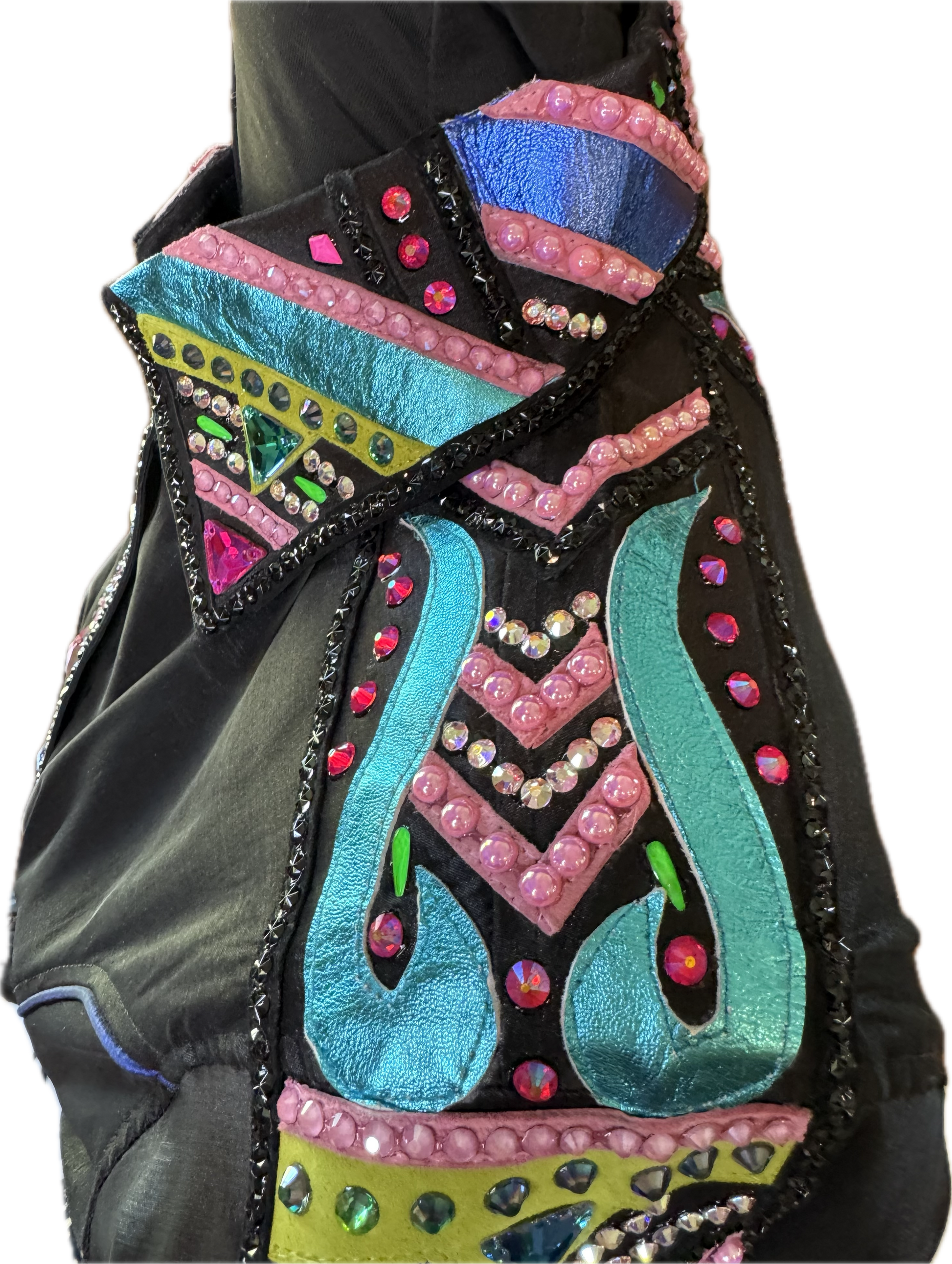 Large Black Stretch Taffeta with Turquoise, Pink, and Green Accents