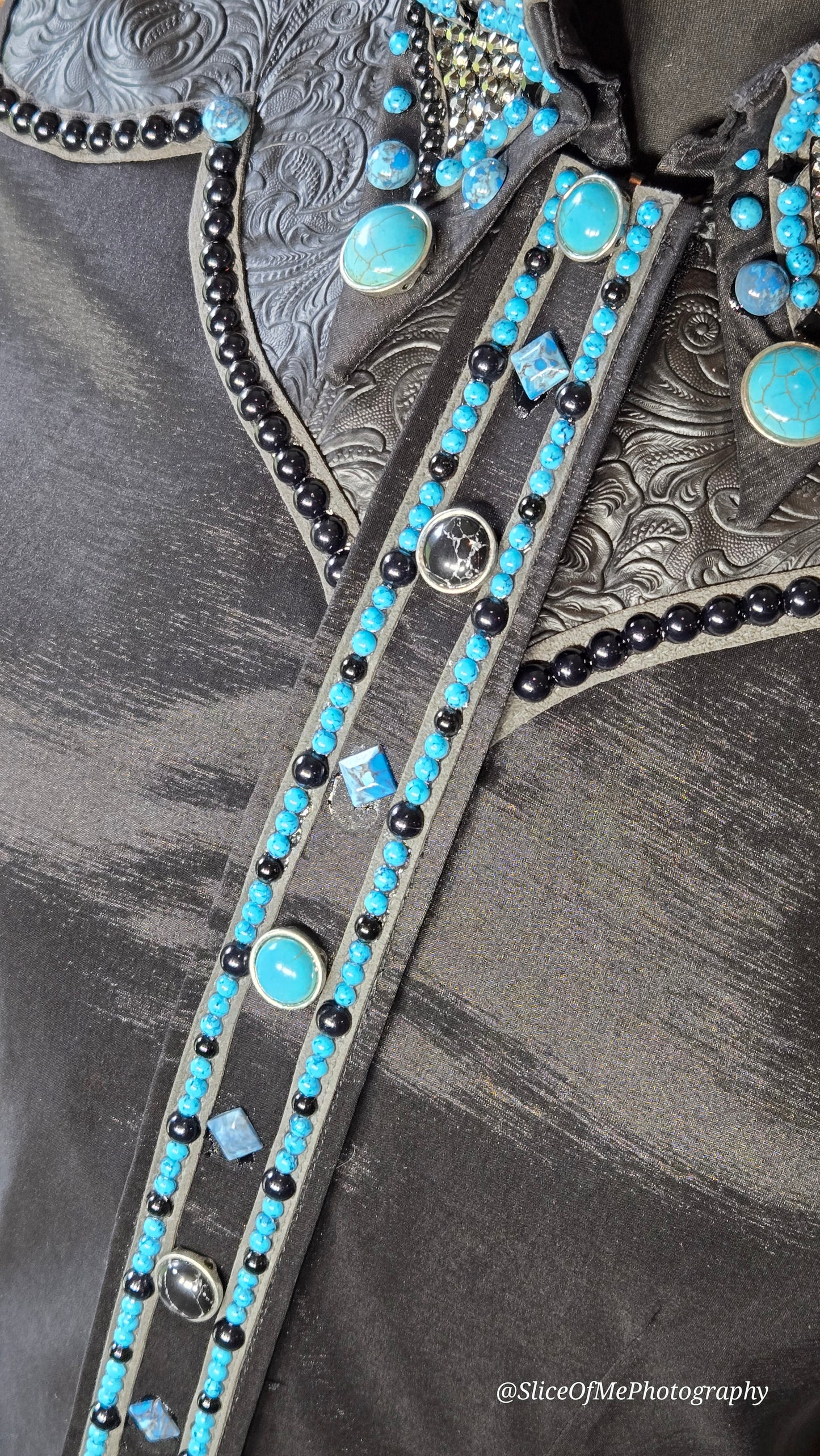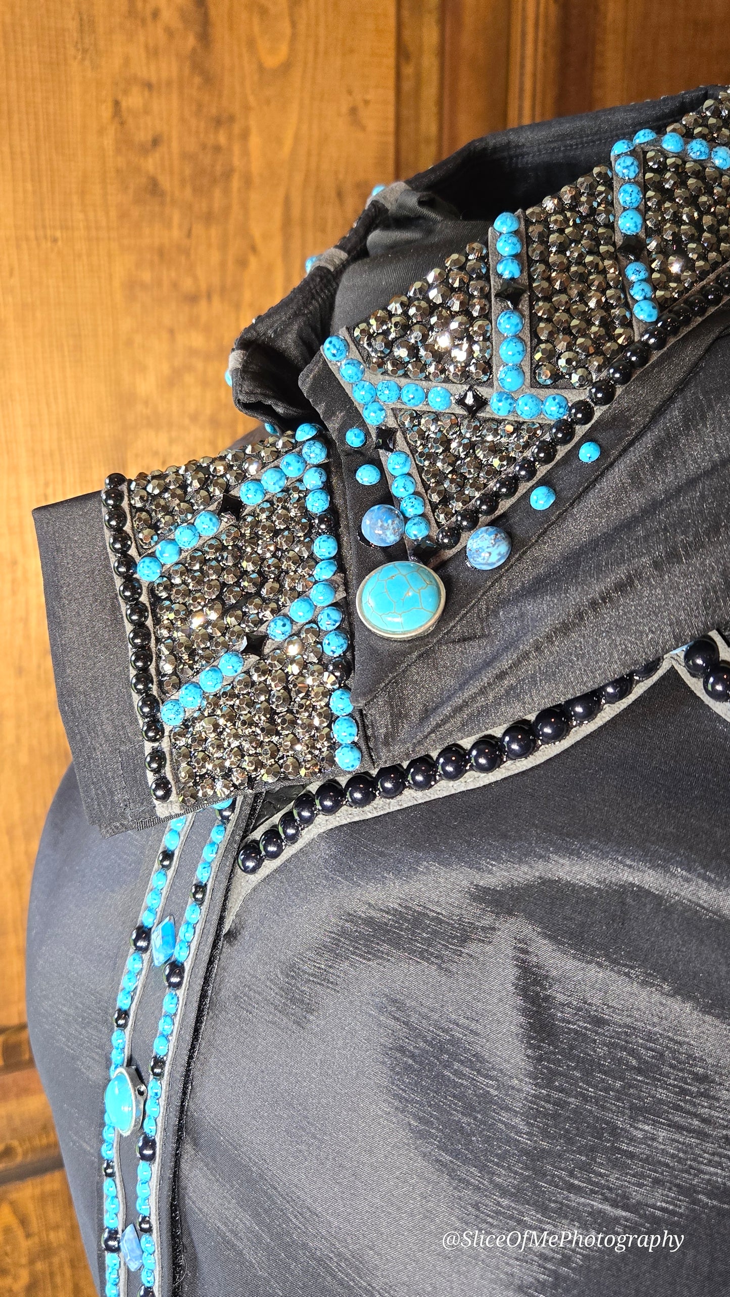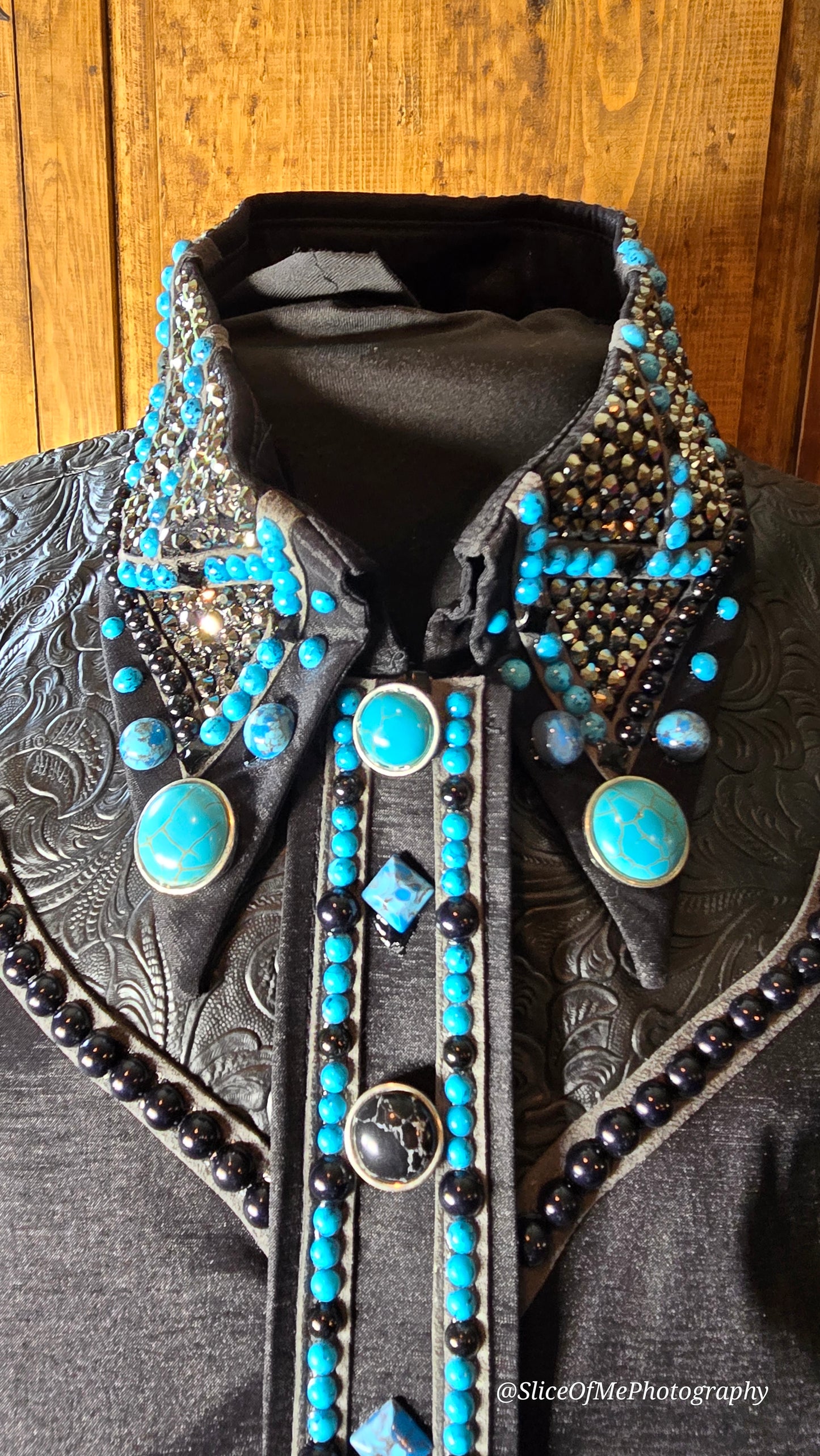 Medium Stretch Taffeta Black Day Shirt with turquois, matte metallic silver and leather texture