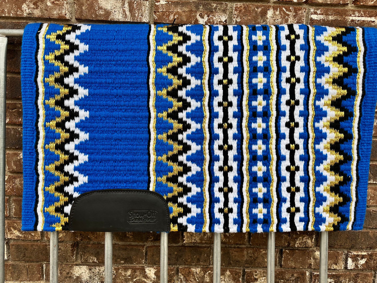 Oversized saddle blanket with wear leathers and carrying case. 34x42. Bright Royal blue base, black, white and metallic gold