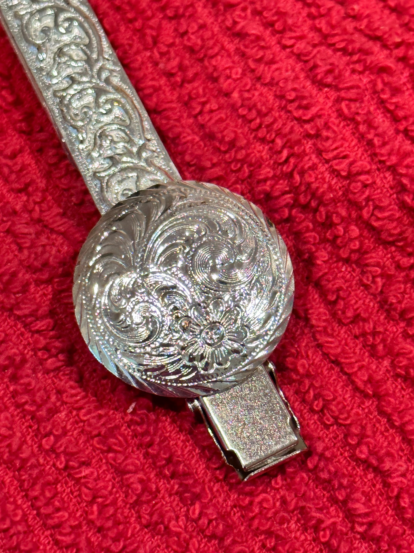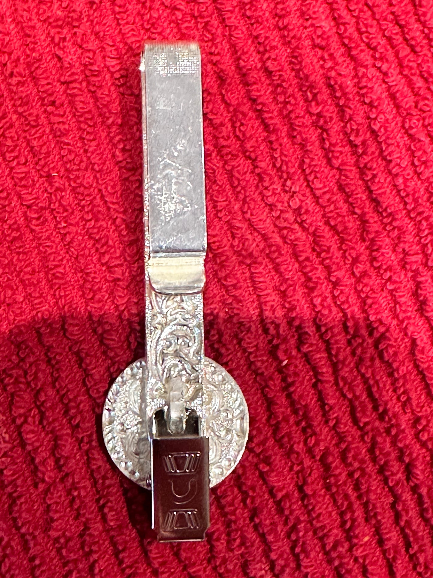 Absolutely stunning silver back number clip. 4.5" in length. Our number clips are sturdy and well built. Fully engraved with design. Add class as well as simplicity to you showing experience.