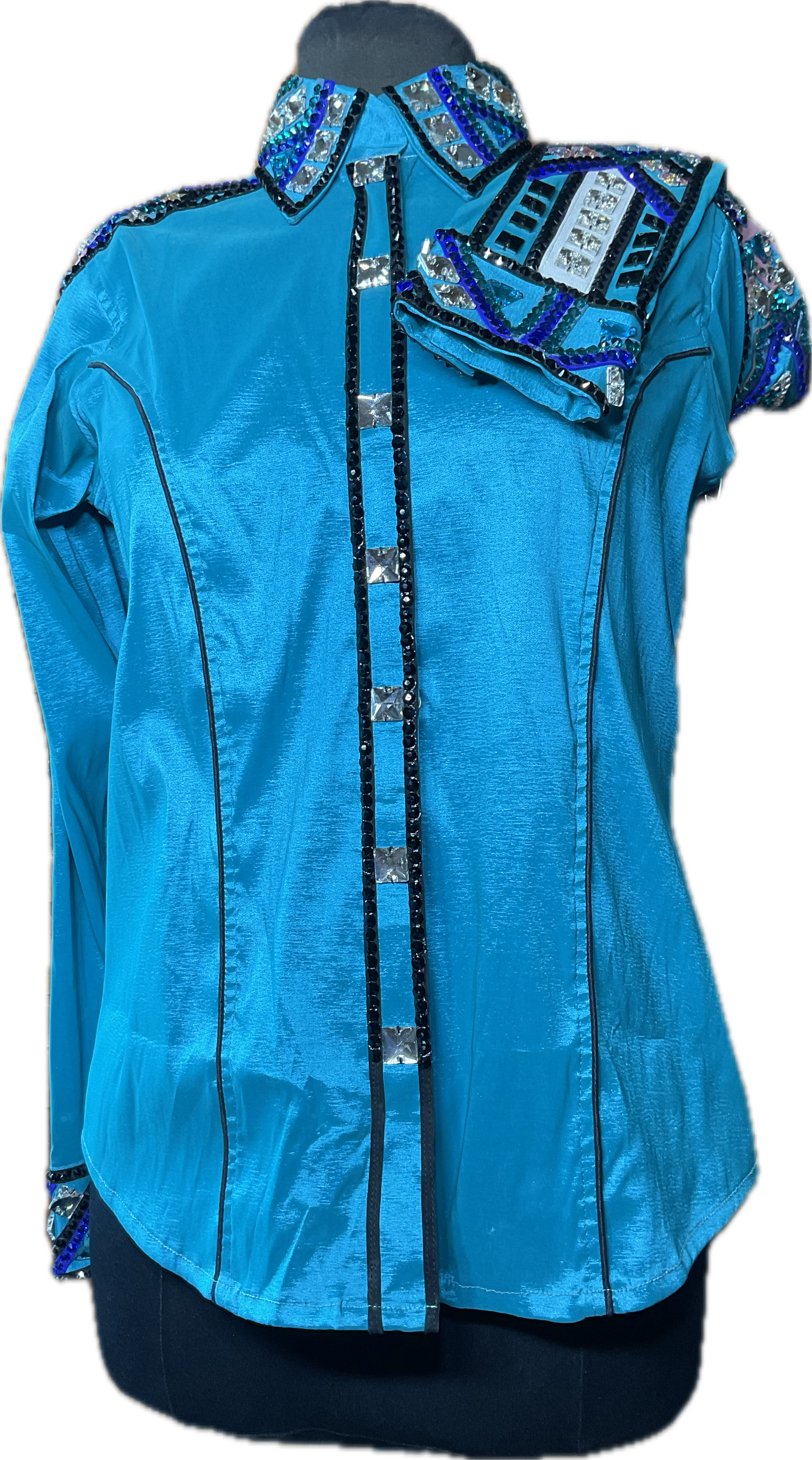Size Large Bright Turquoise Stretch Taffeta Day Shirt With Royal Blue, Pink and Clear Accents