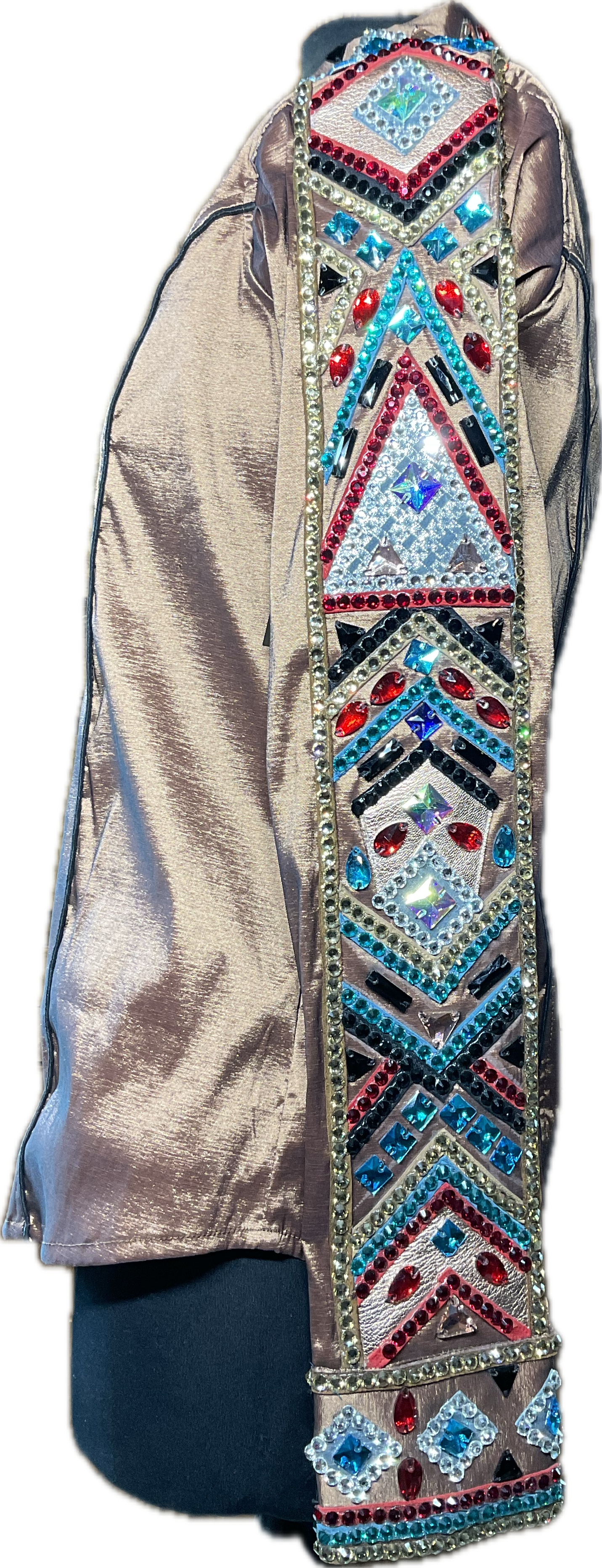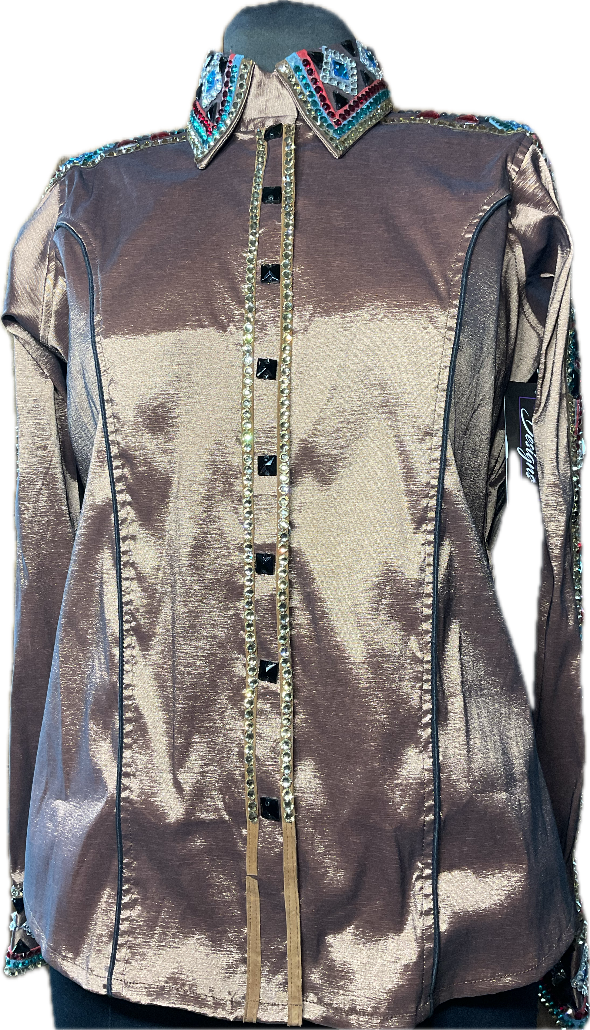 Size Large Brown Stretch Taffeta Day Shirt With Black, Gold, Red and Aqua Blue Accents