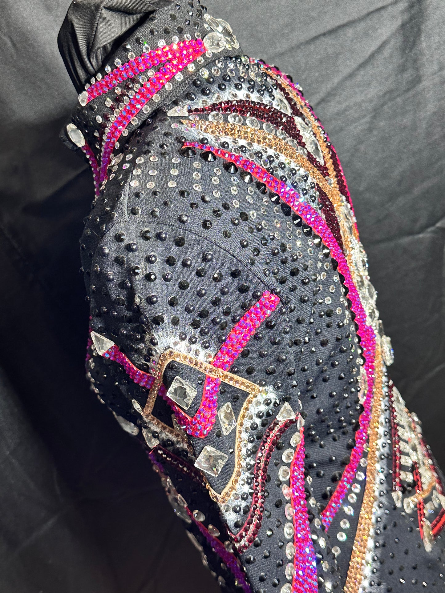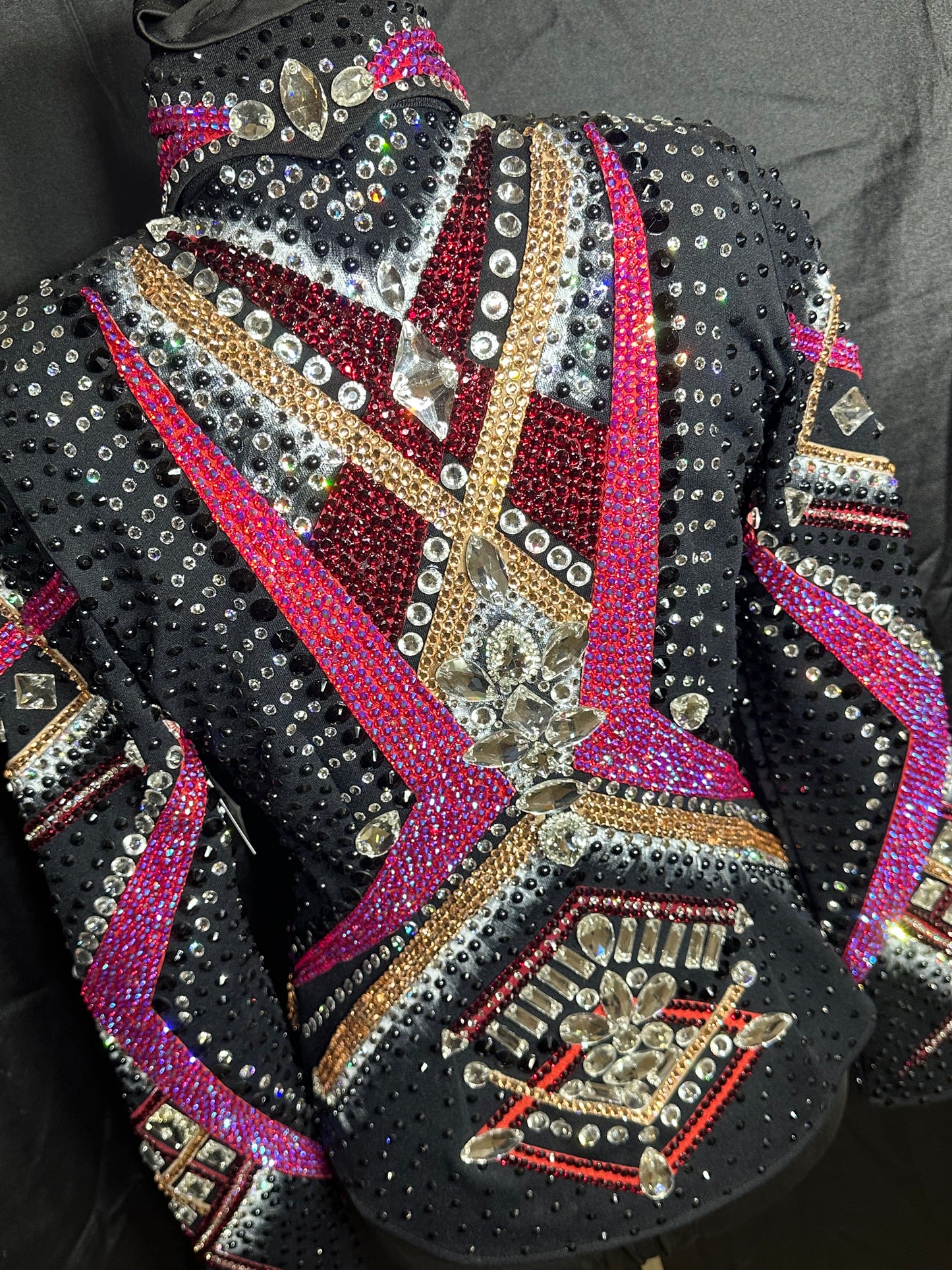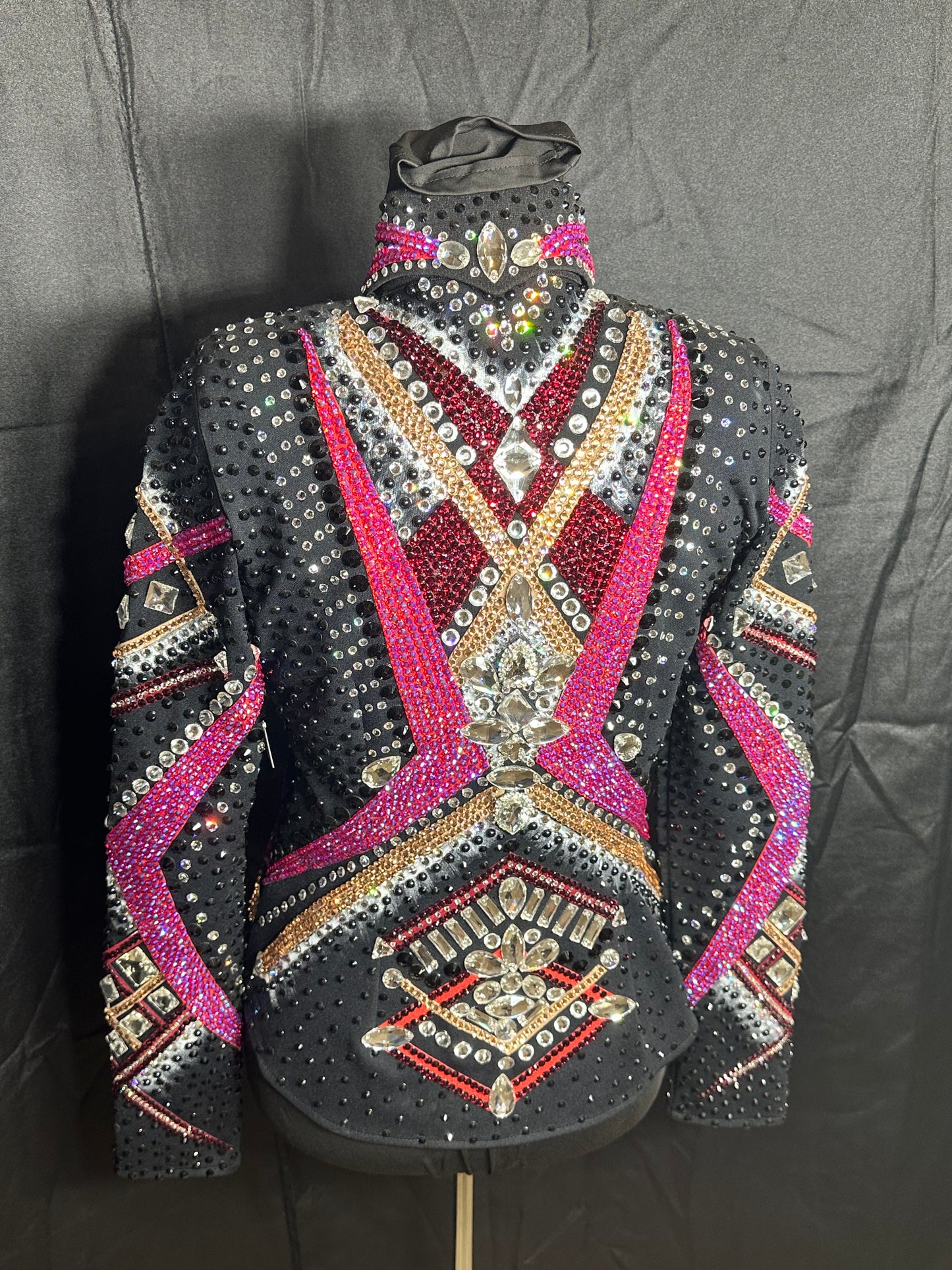 Small jacket (showmanship or riding) brand new. Lots of sparkles! covered in rhinestones. Black jacket with rose, rose gold and white accents.