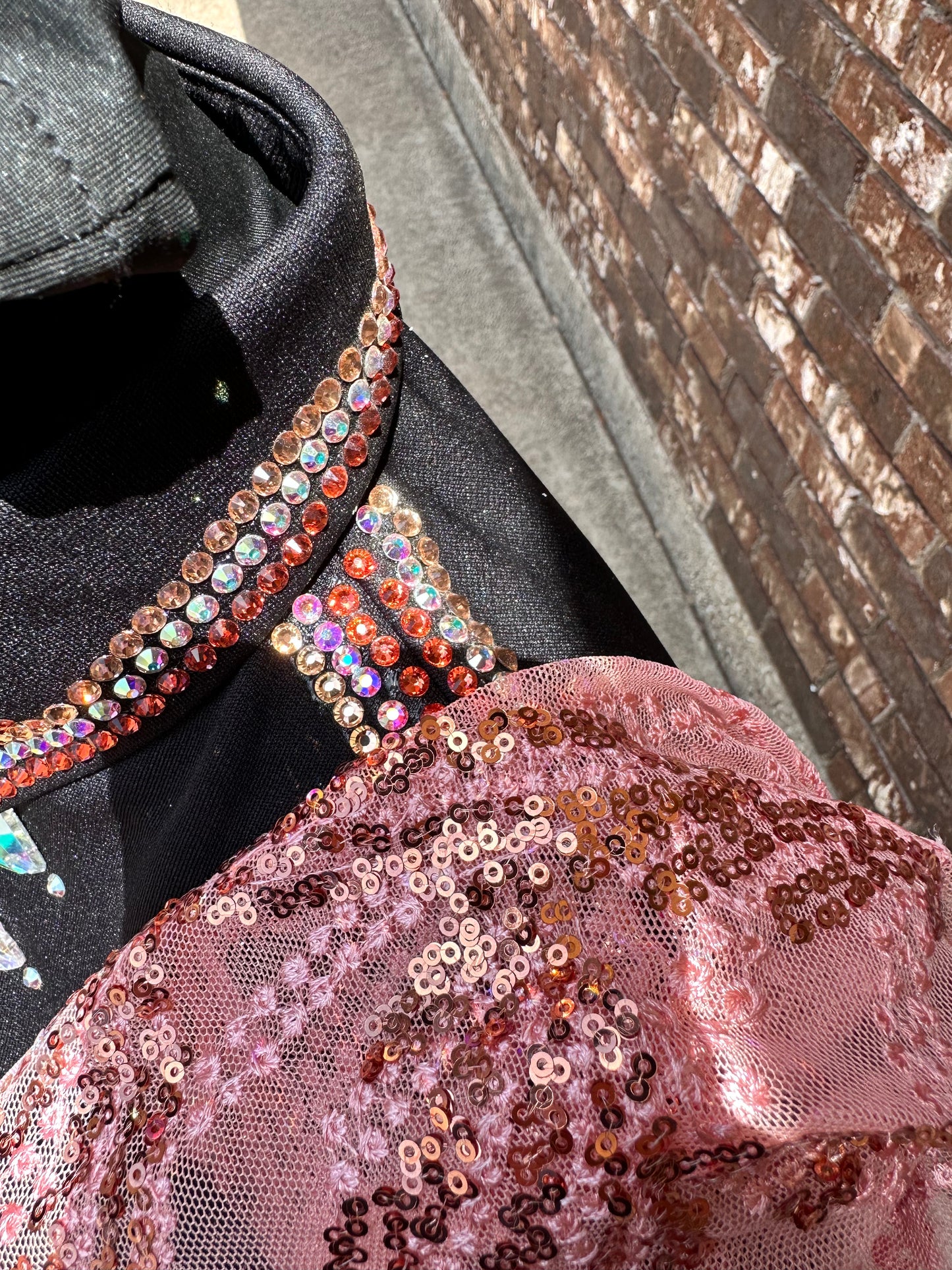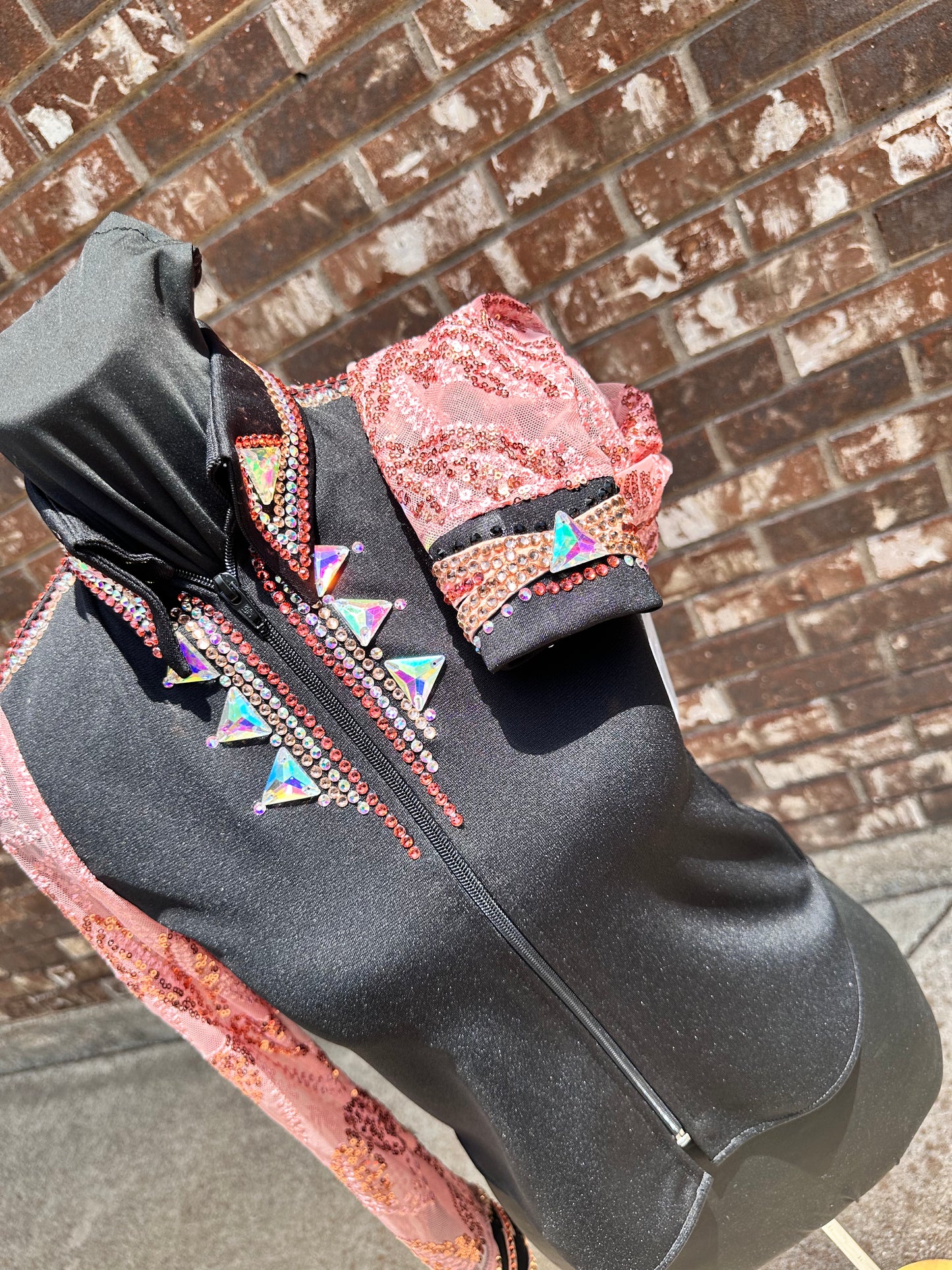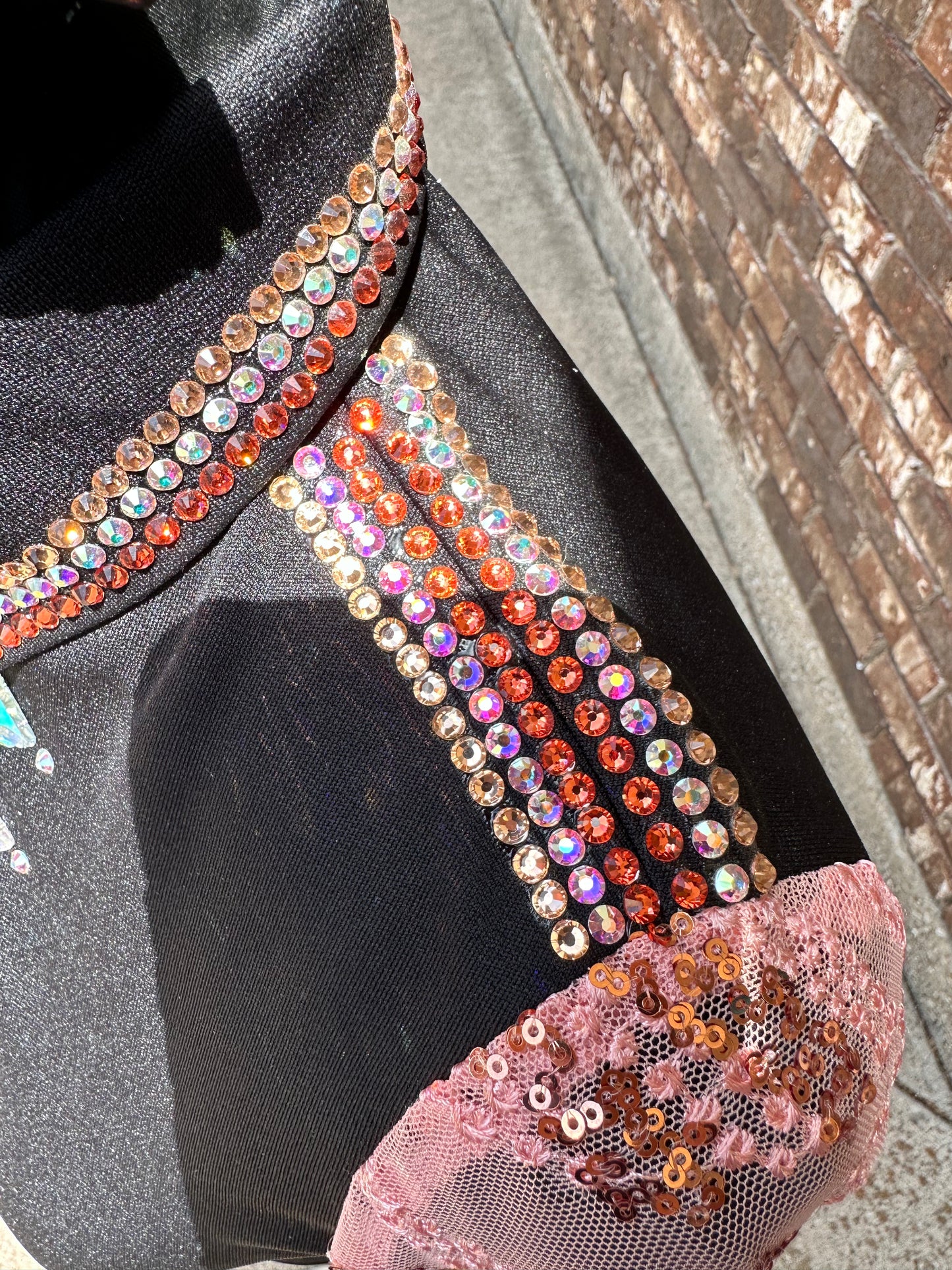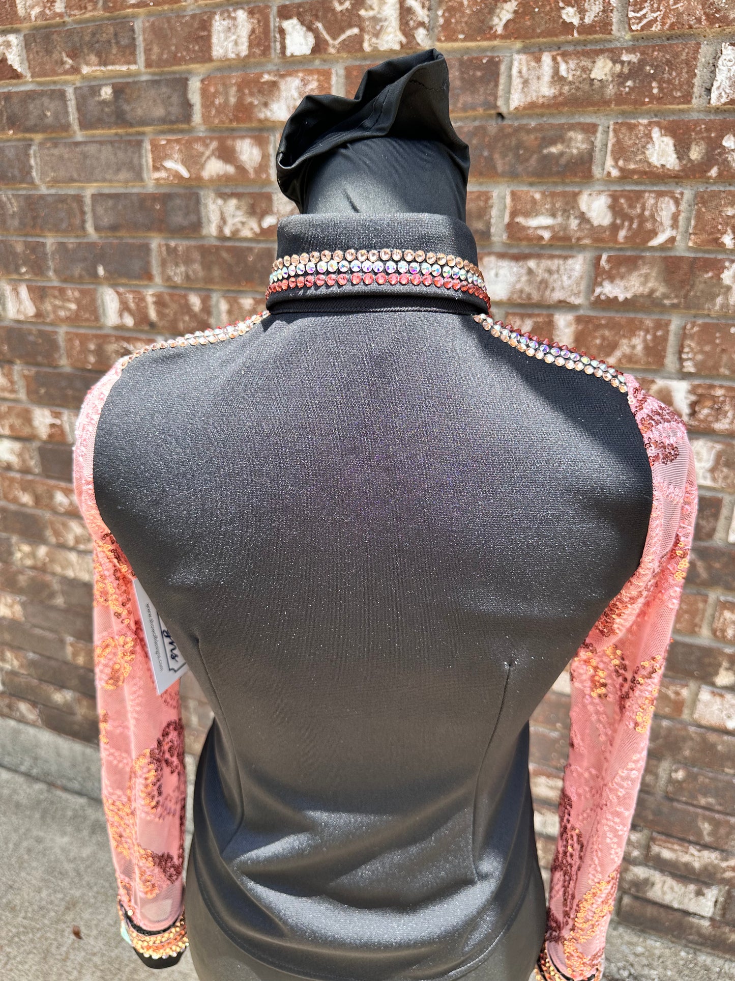 Kids black day shirt with peach lace sleeves. Rhinestoned shoulder, cUFC’s, collar and front.