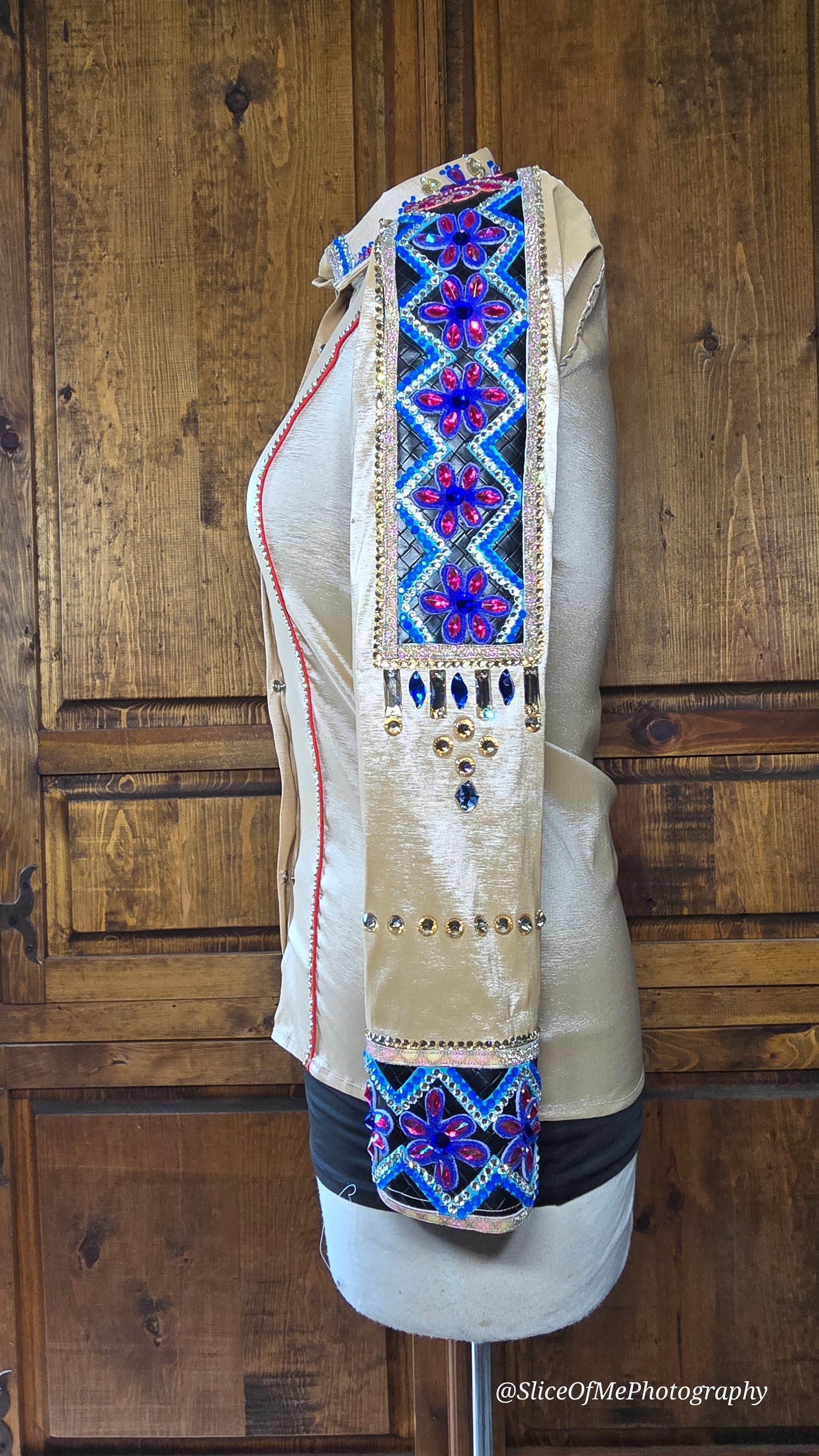 XS Fawn Stretch Taffeta Day Shirt Zippered Cuff with show red, royal blue, silver, white gold with